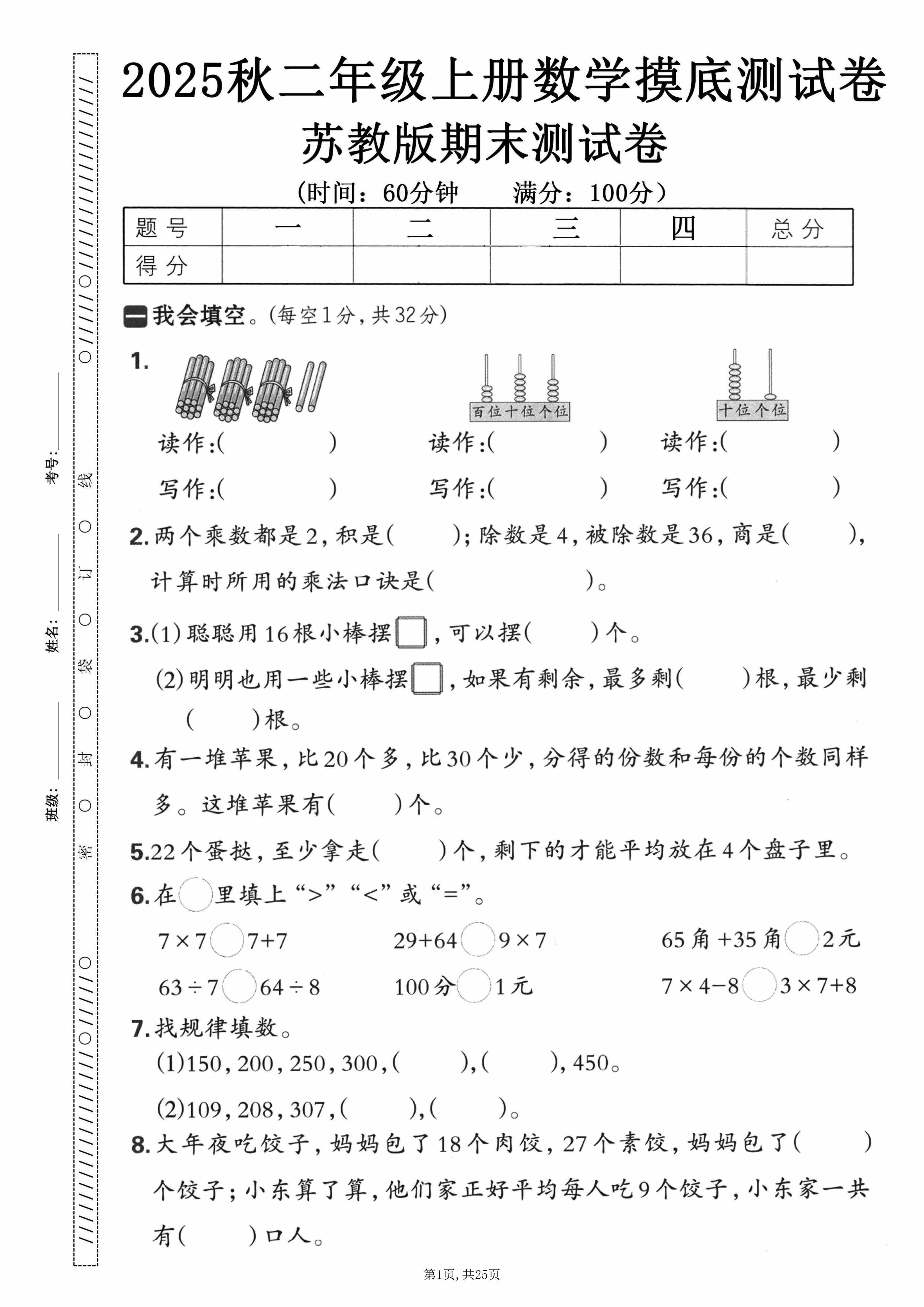 二年级(上)数学 期末押题模拟测试卷全5套《苏教版》(含答案25页)