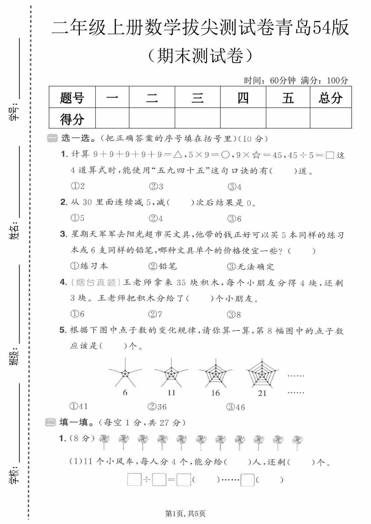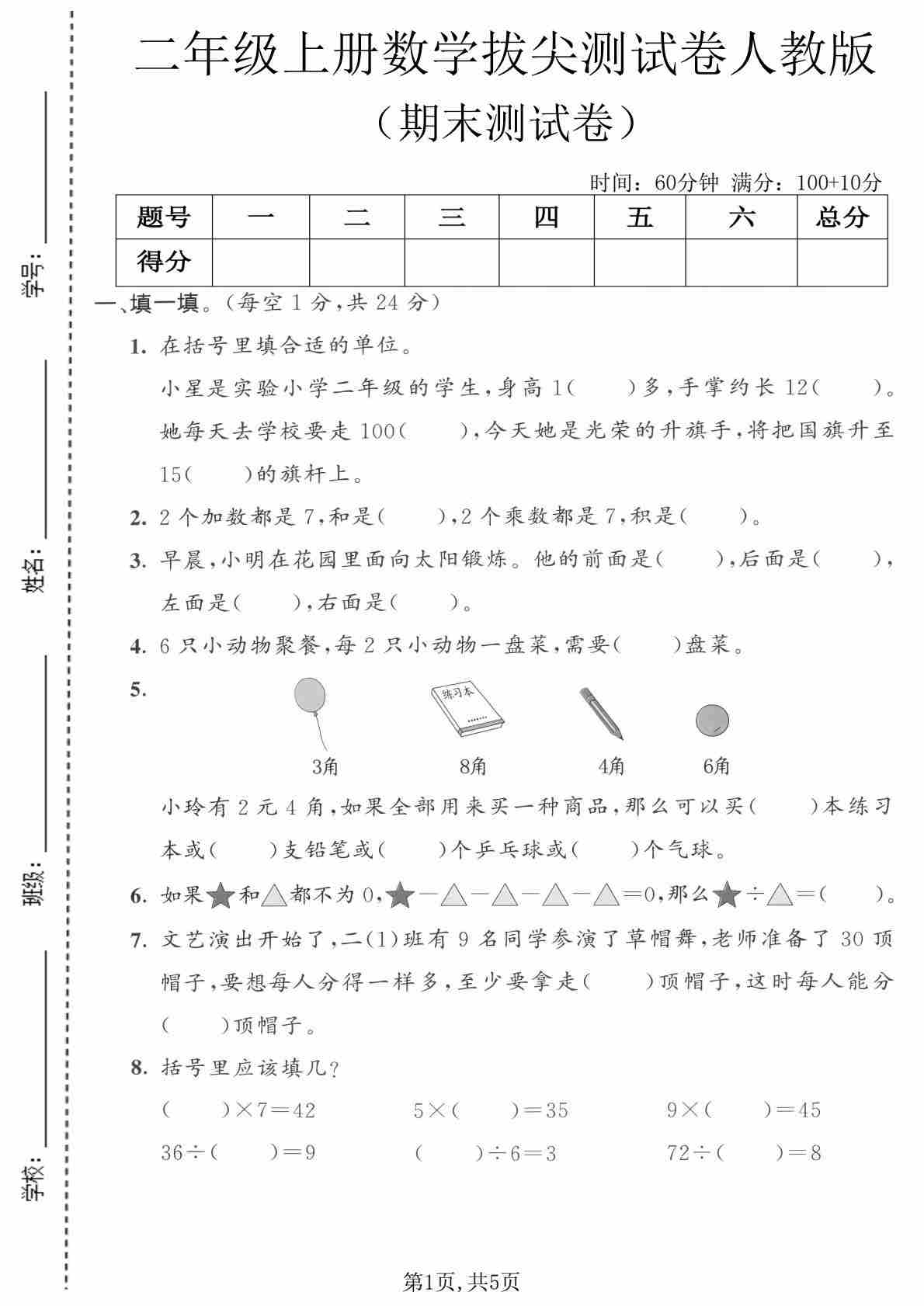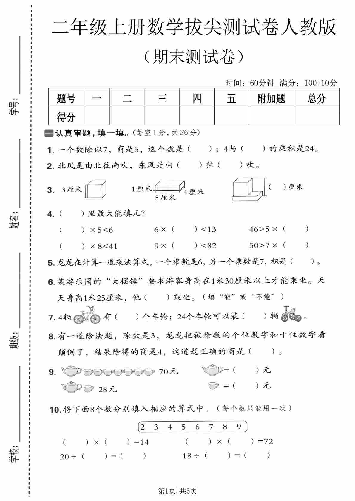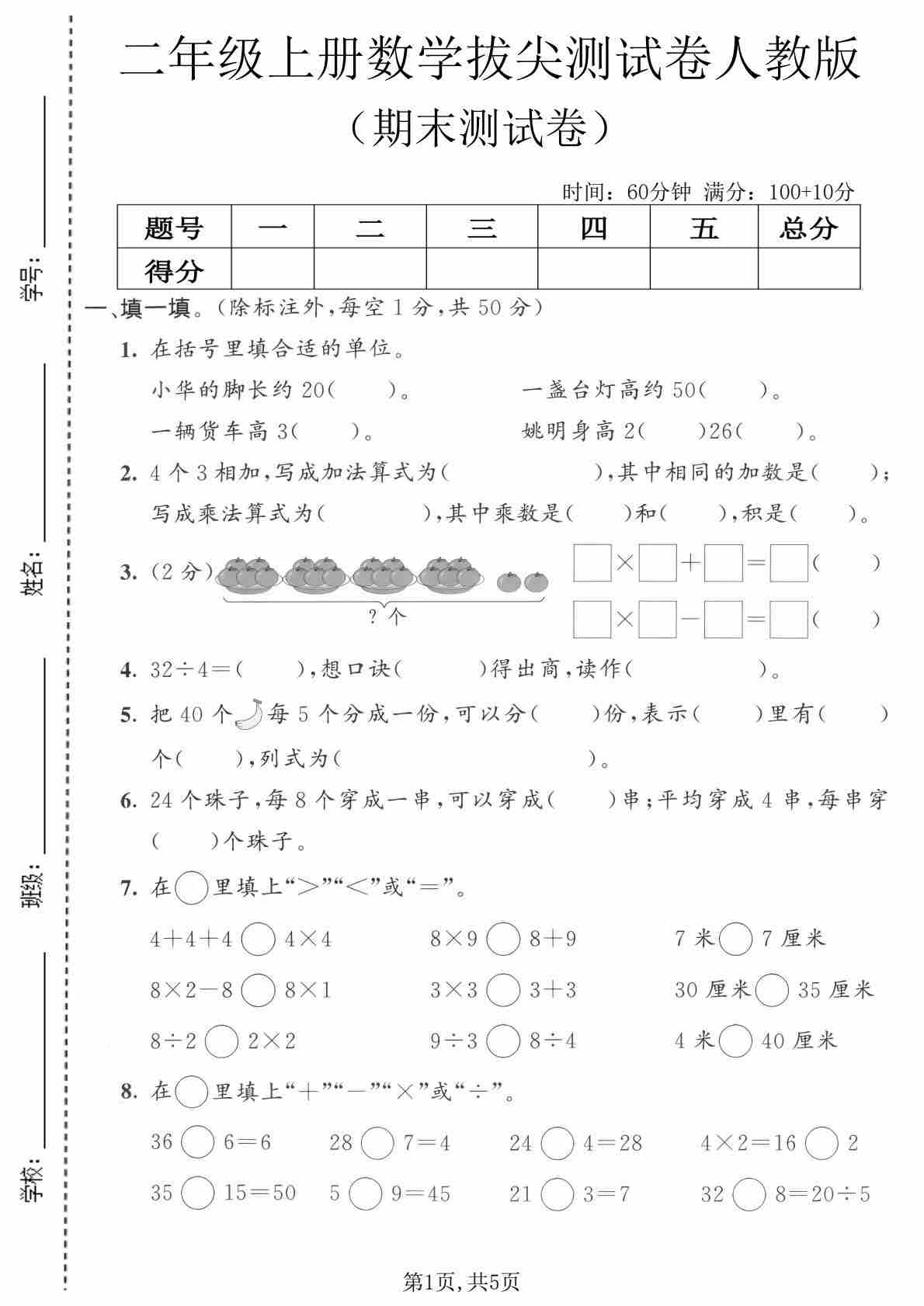 二年级(上)数学 期末拔尖测试卷5《人教版》