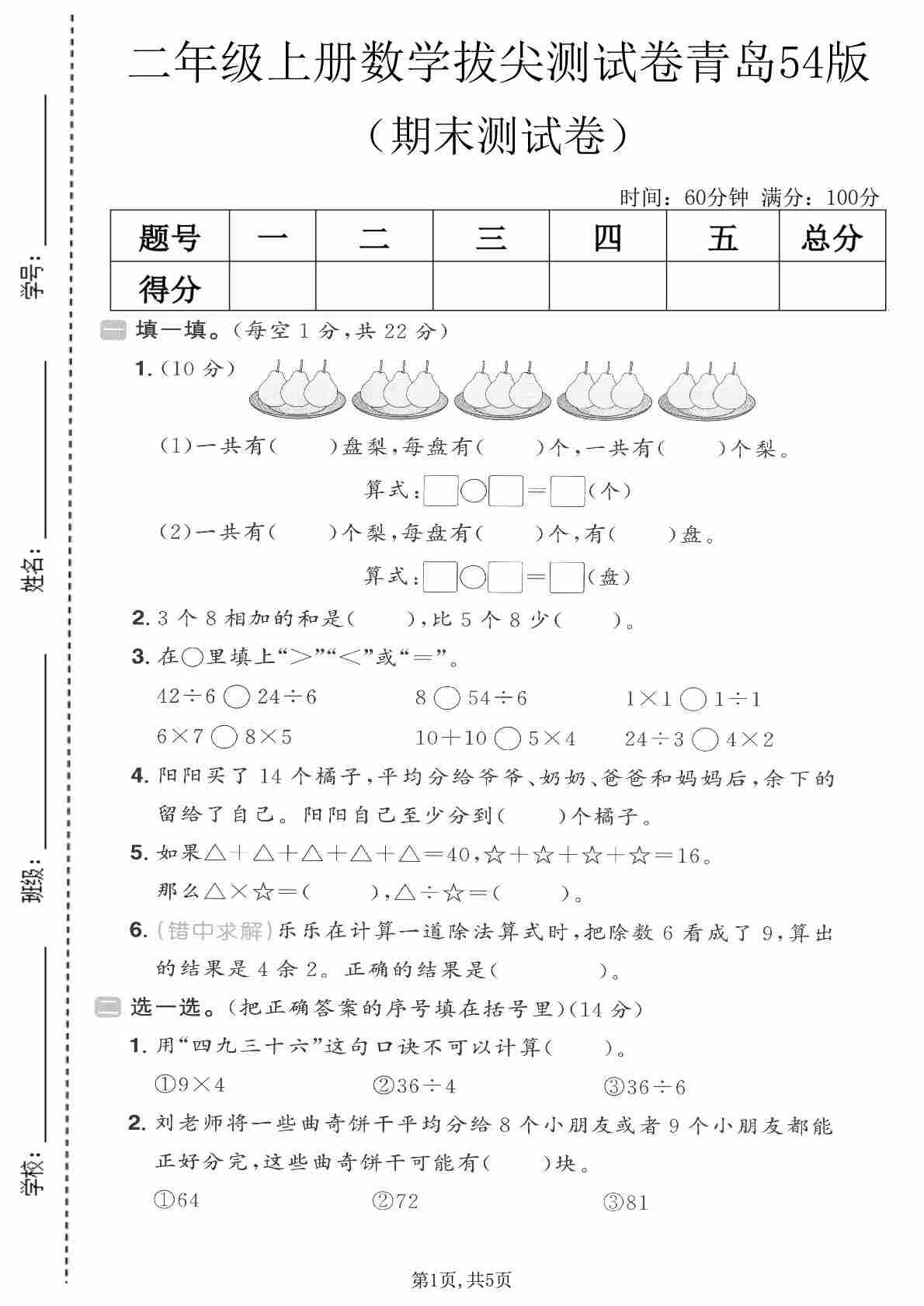 二年级(上)数学期末拔尖测试卷5《青岛54版》