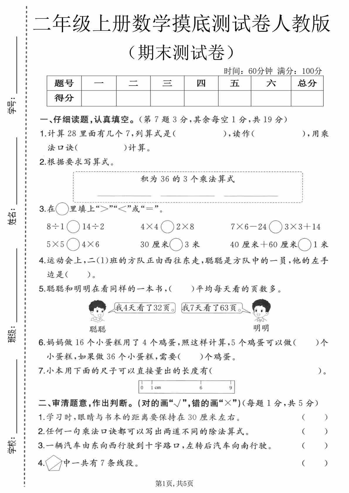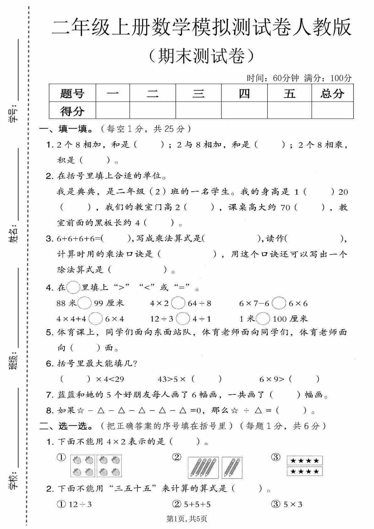 二年级(上)数学 期末摸底测试卷1《人教版》