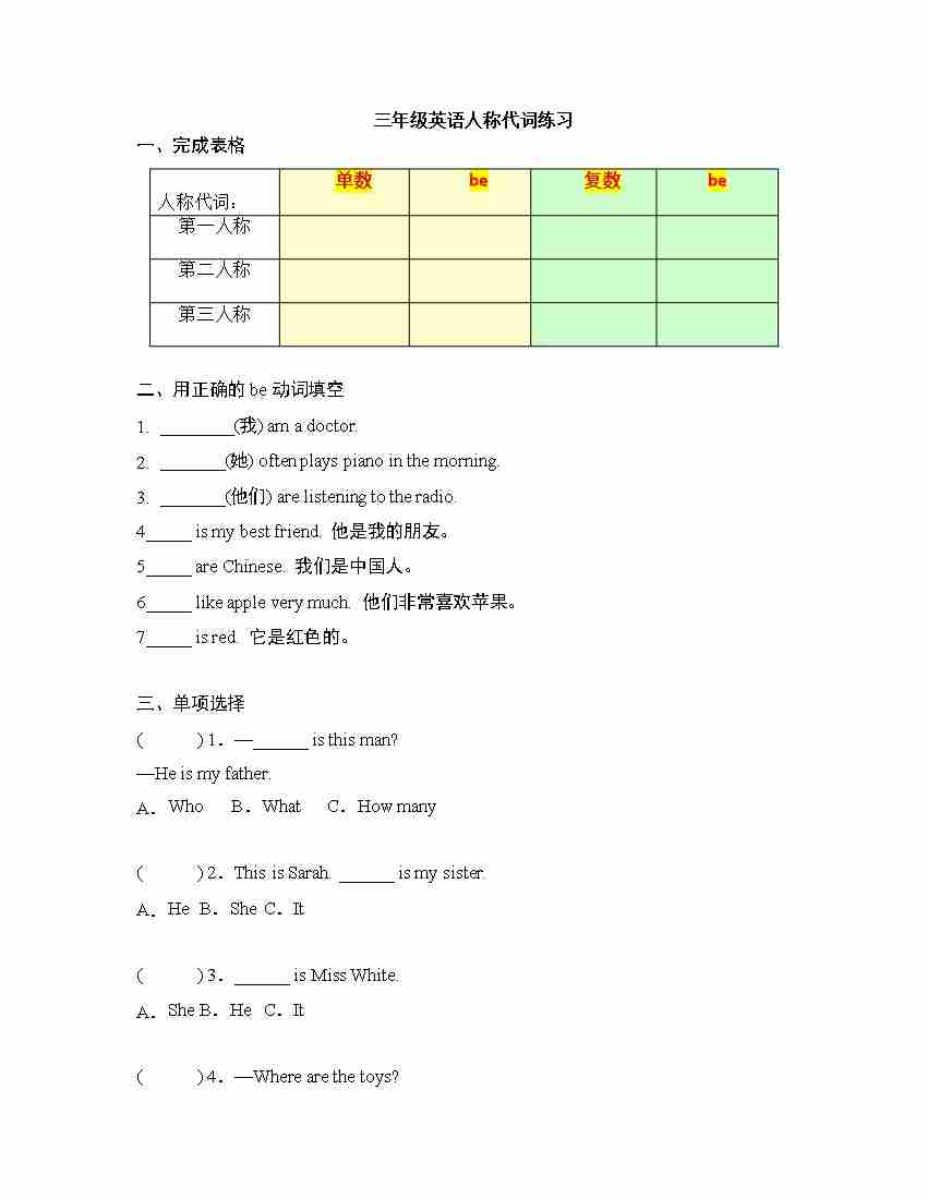 人称代词(专项训练)- 教科版(2024)英语三年级下册