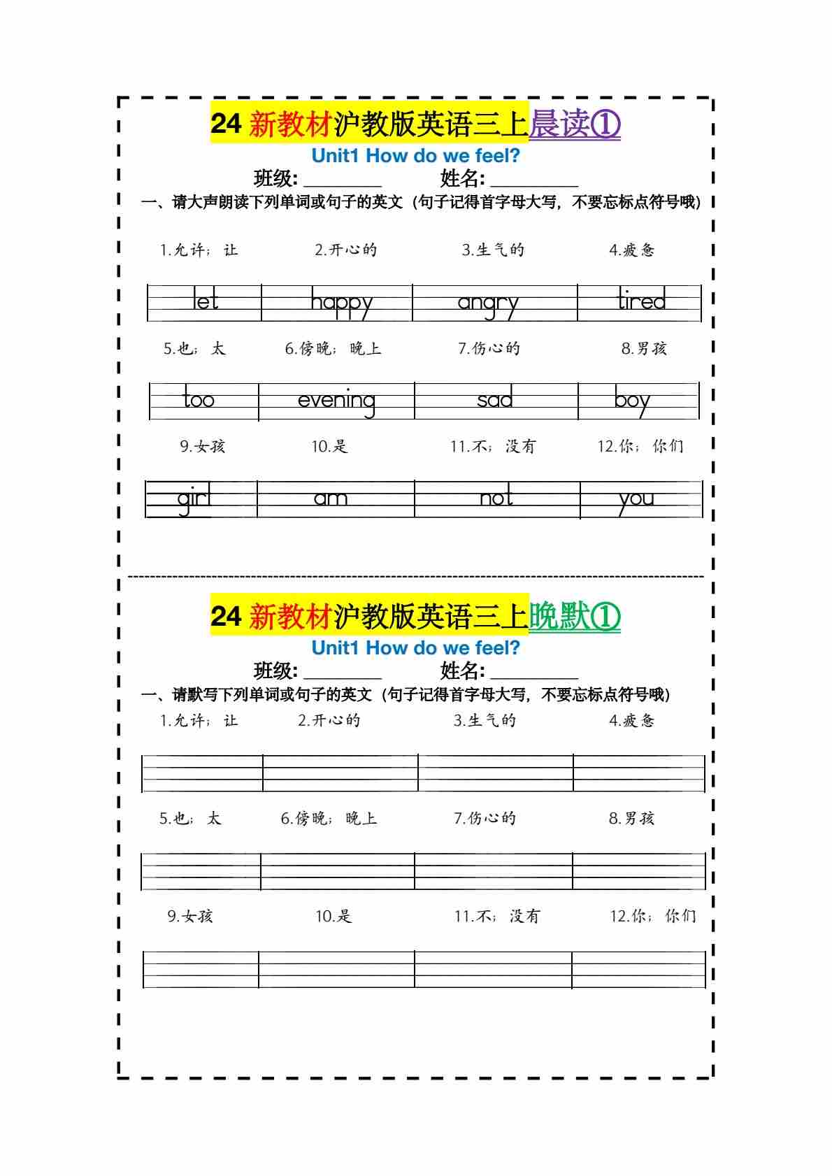 24新教材沪教版英语三上 四线三格