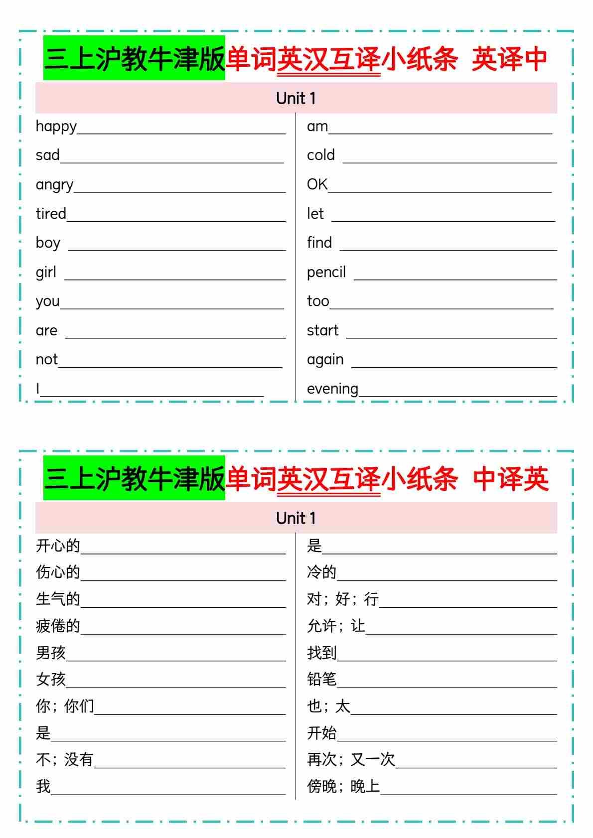 三上沪教牛津版单词英汉互译小纸条