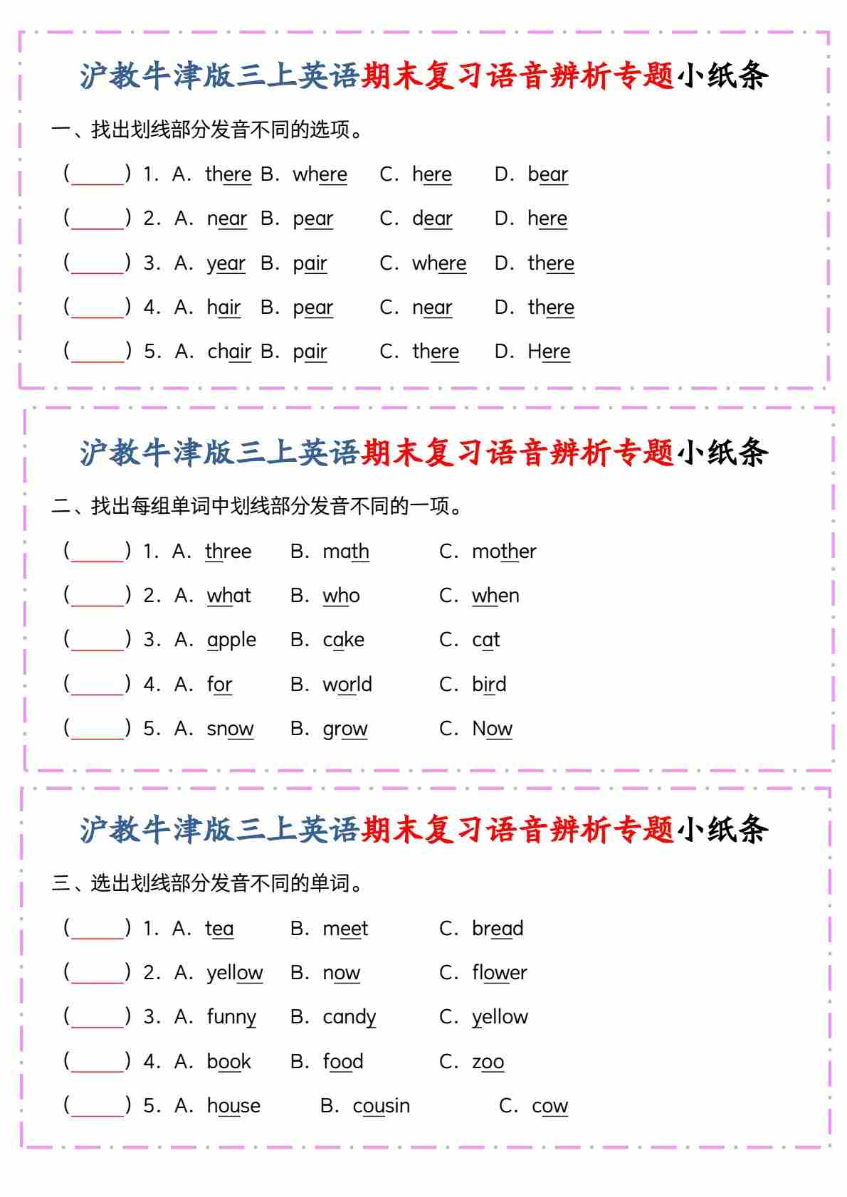 三上沪教牛津版期末复习语音辨析专题小纸条
