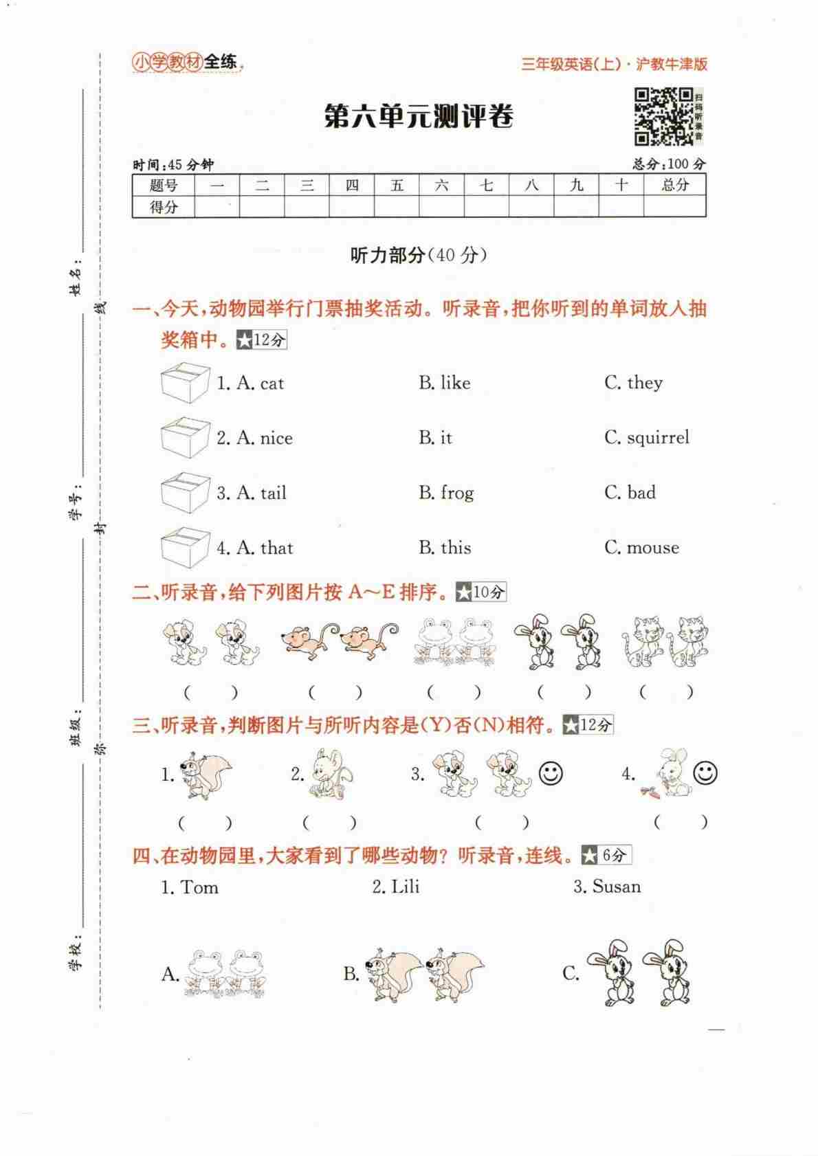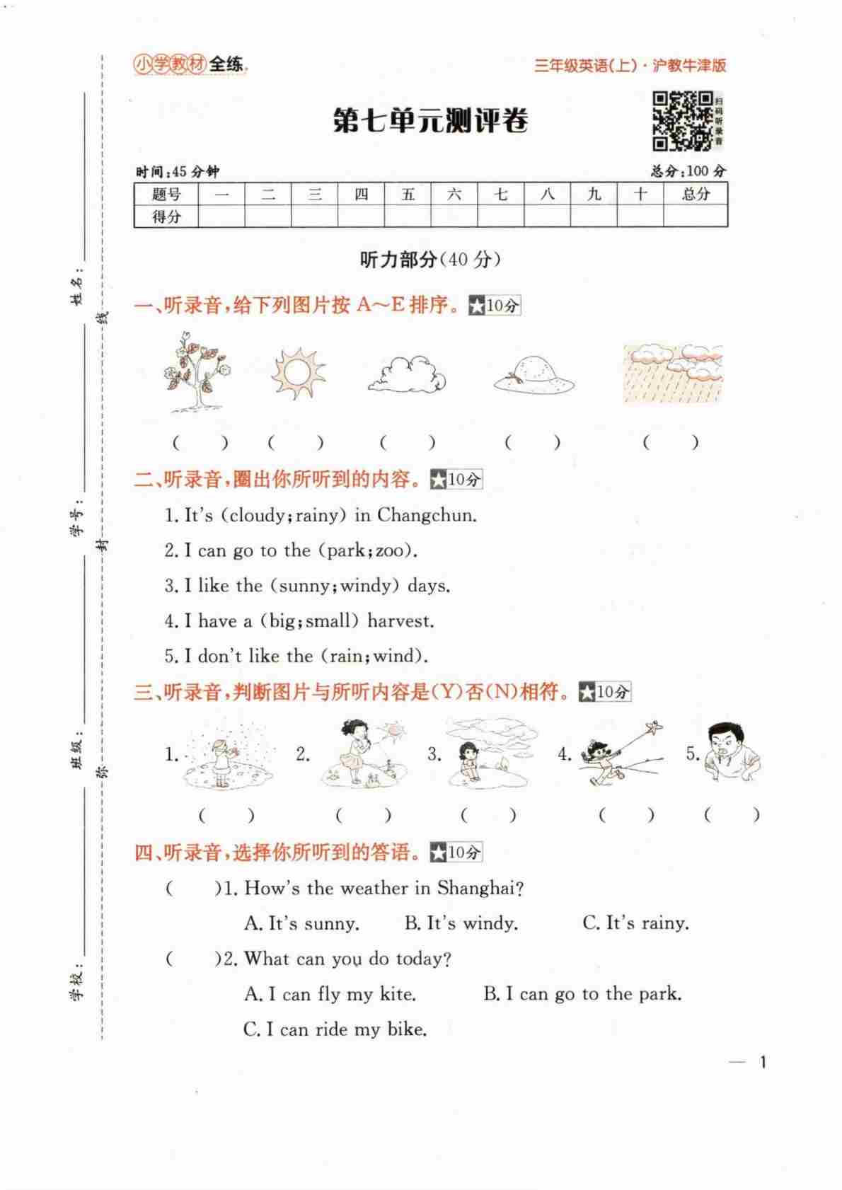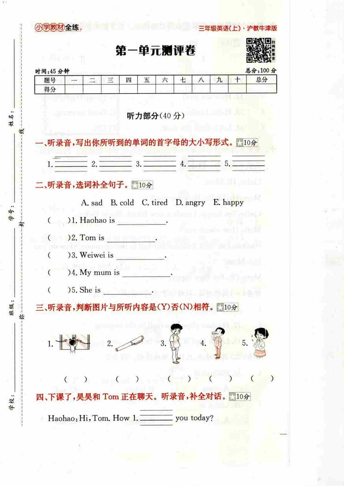 三上沪教Unit1-2(单元测试)-2024-2025学年沪教版(2024)英语三年级上册