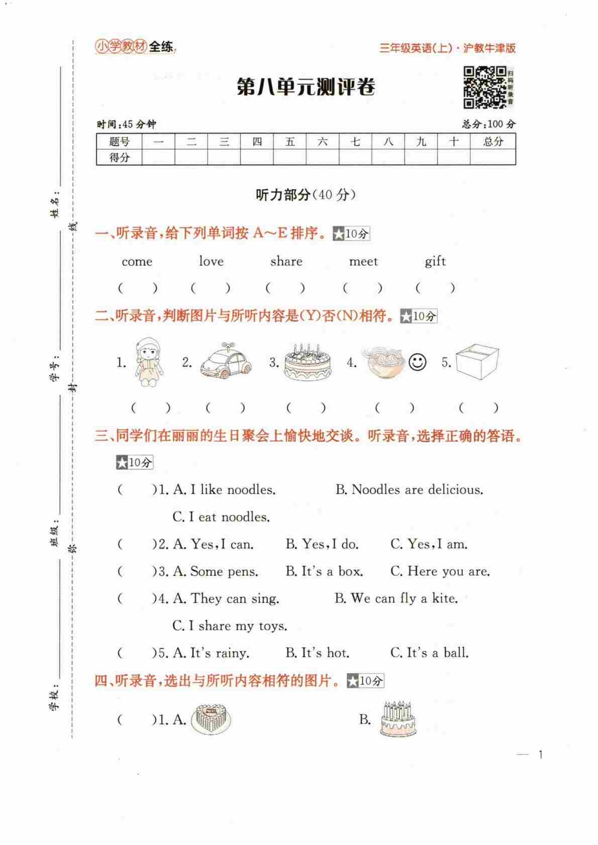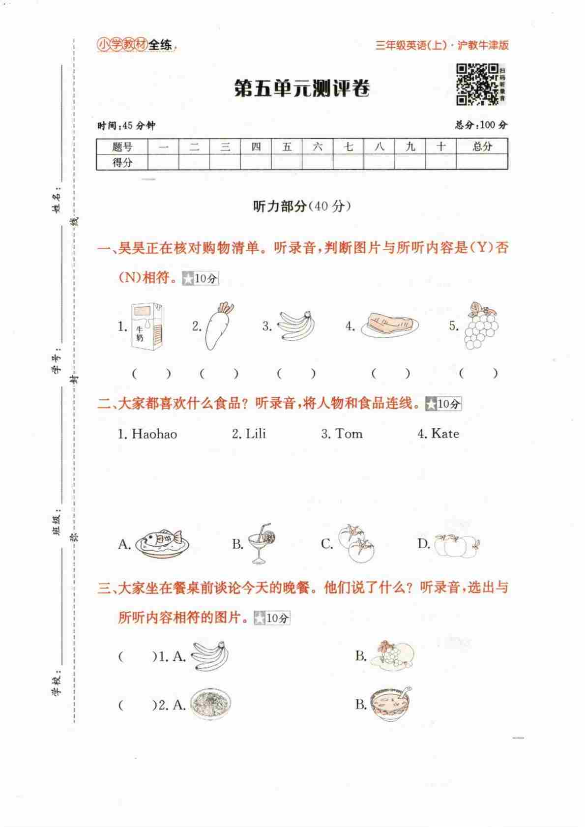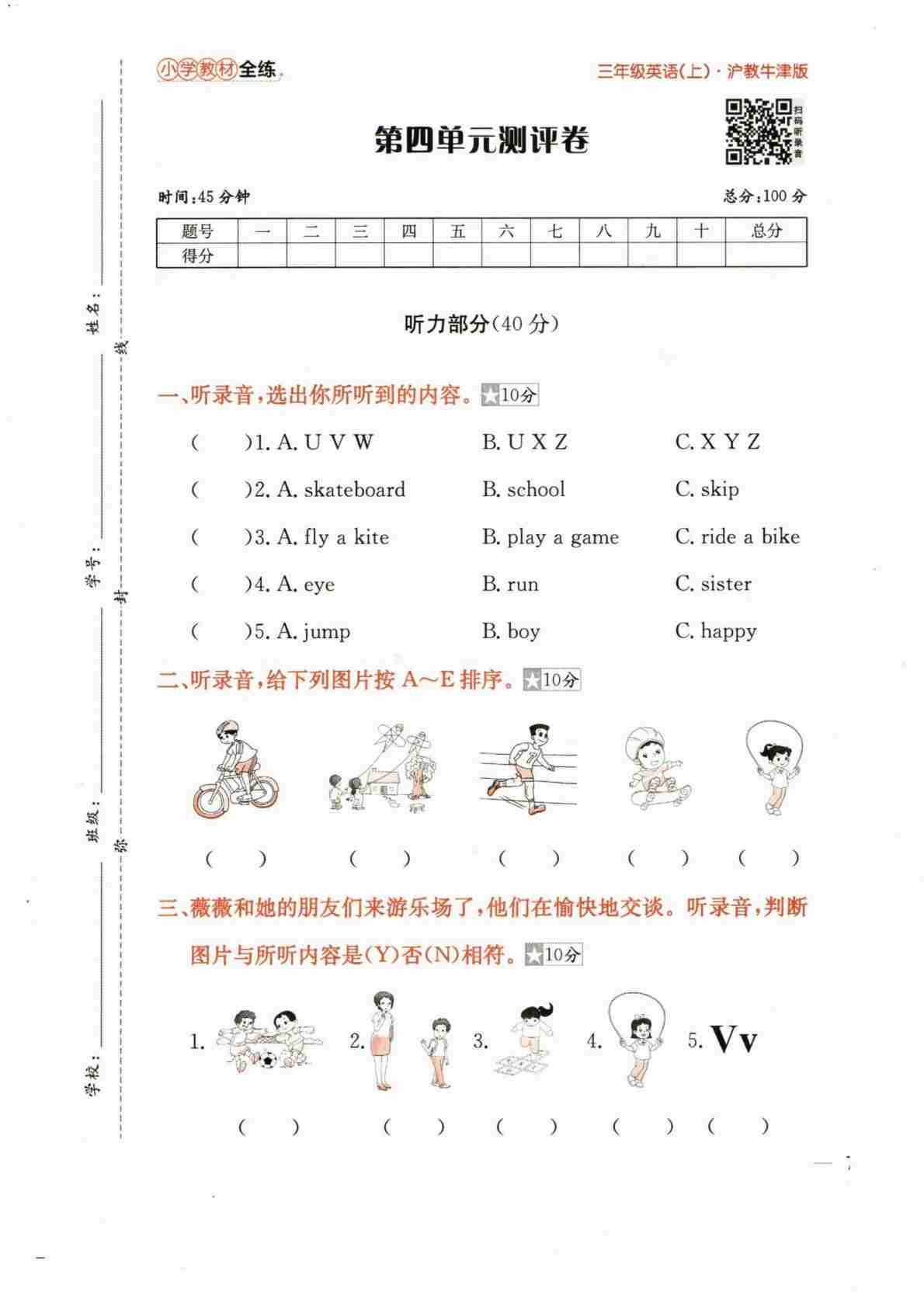 三上沪教Unit1-2(单元测试)-2024-2025学年沪教版(2024)英语三年级上册
