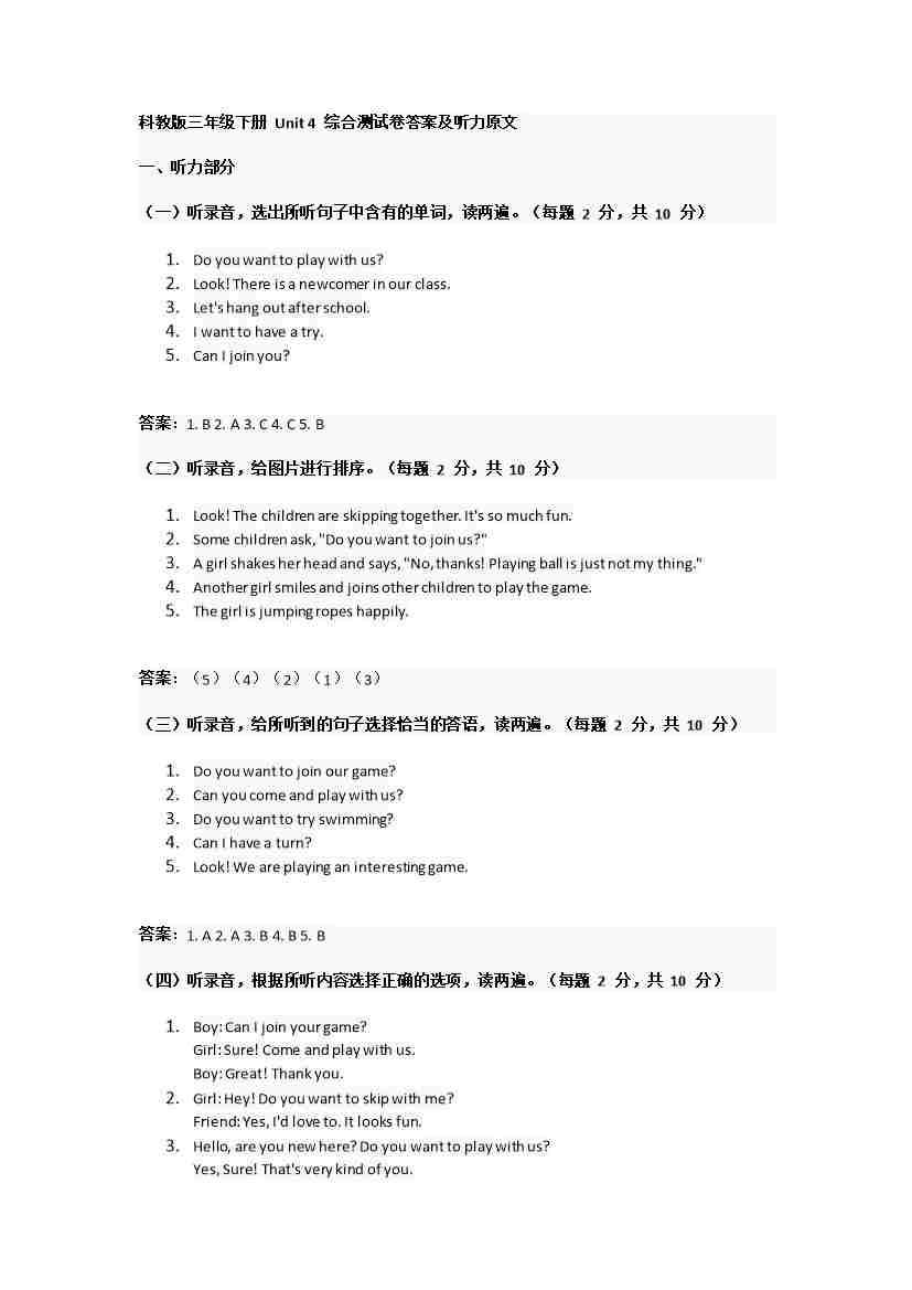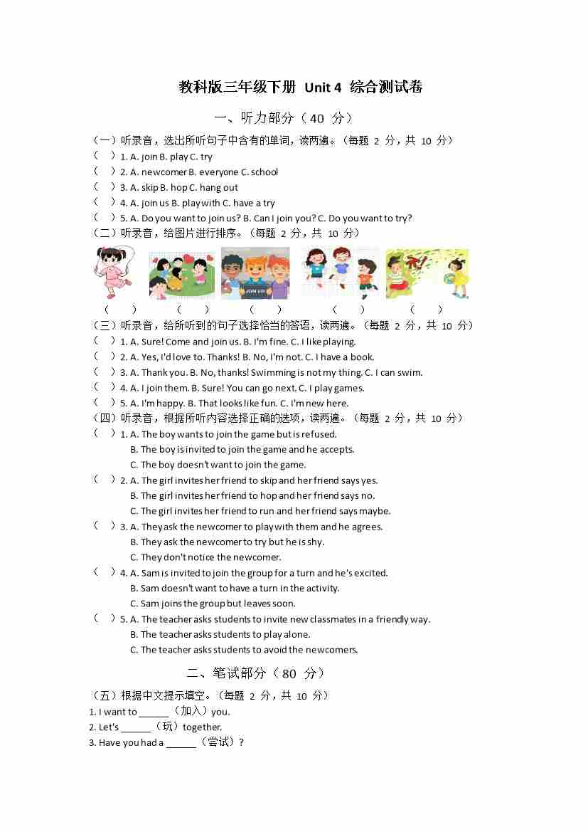 教科版三年级下册 Unit 4 综合测试卷-含听力原文及答案