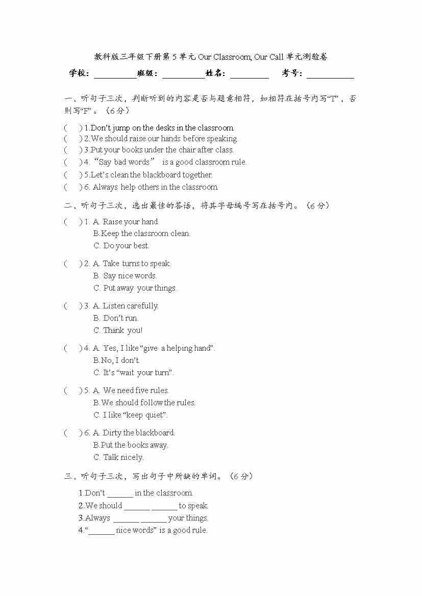 教科版三年级下册第5单元Our Classroom, our call单元测验卷(含听力音频,听力文本和答案)