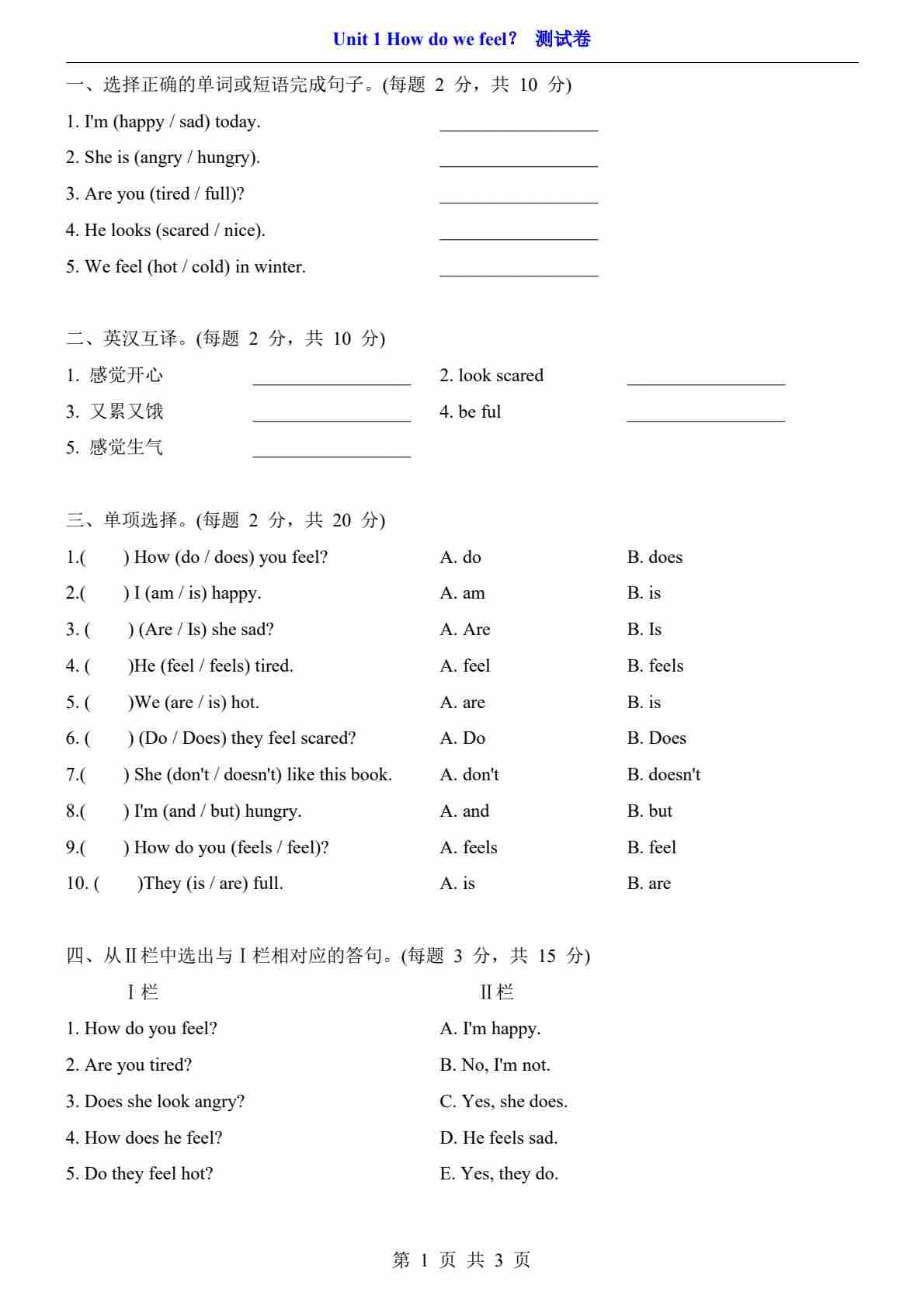 三上沪教Unit 1 How+do+we+feel?(单元测试)+2024-2025学年沪教版(2024)英语三年级上册