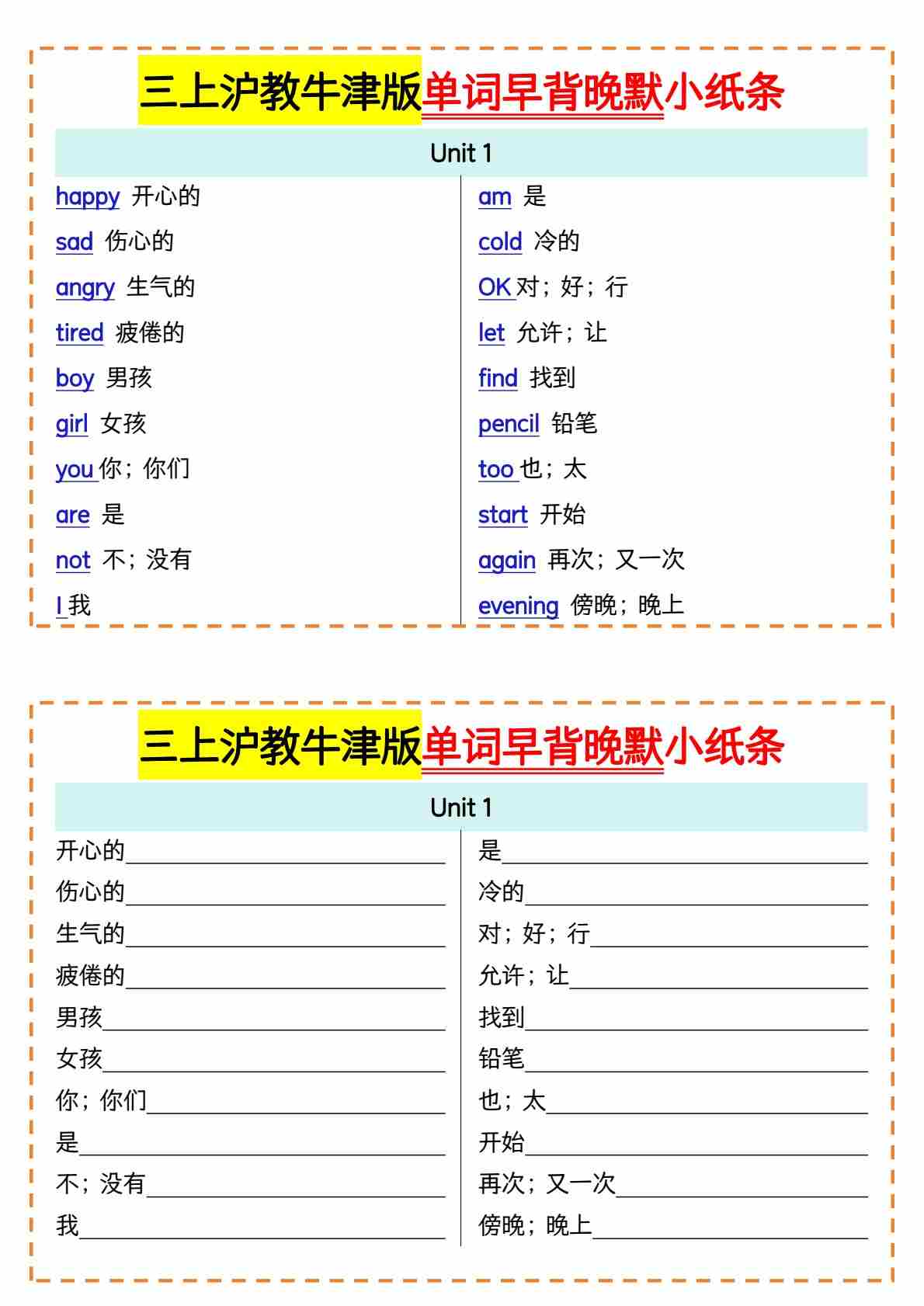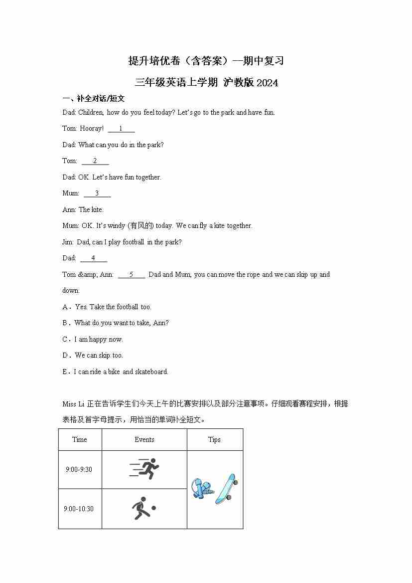 提升培优卷(含答案)--期中复习 三年级英语上学期 沪教版2024