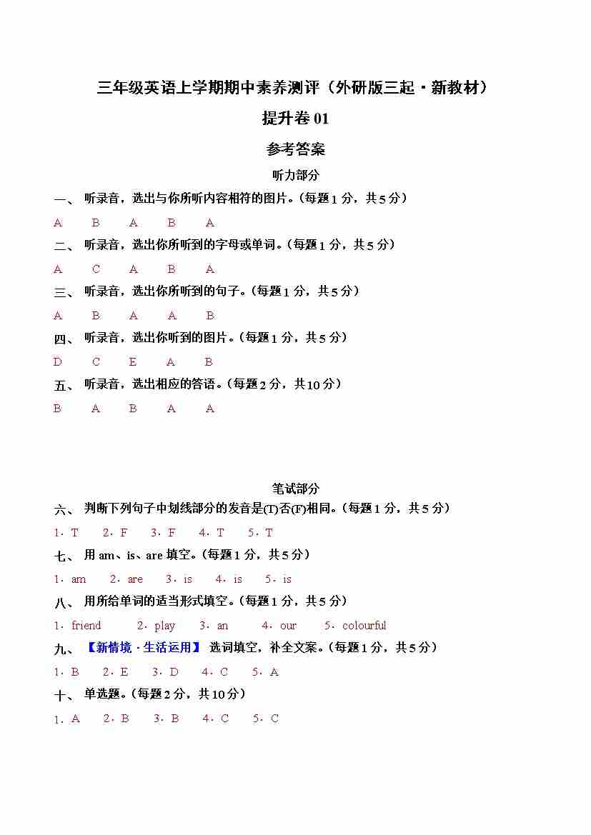 三上新外研英语(提升卷01)(参考答案)