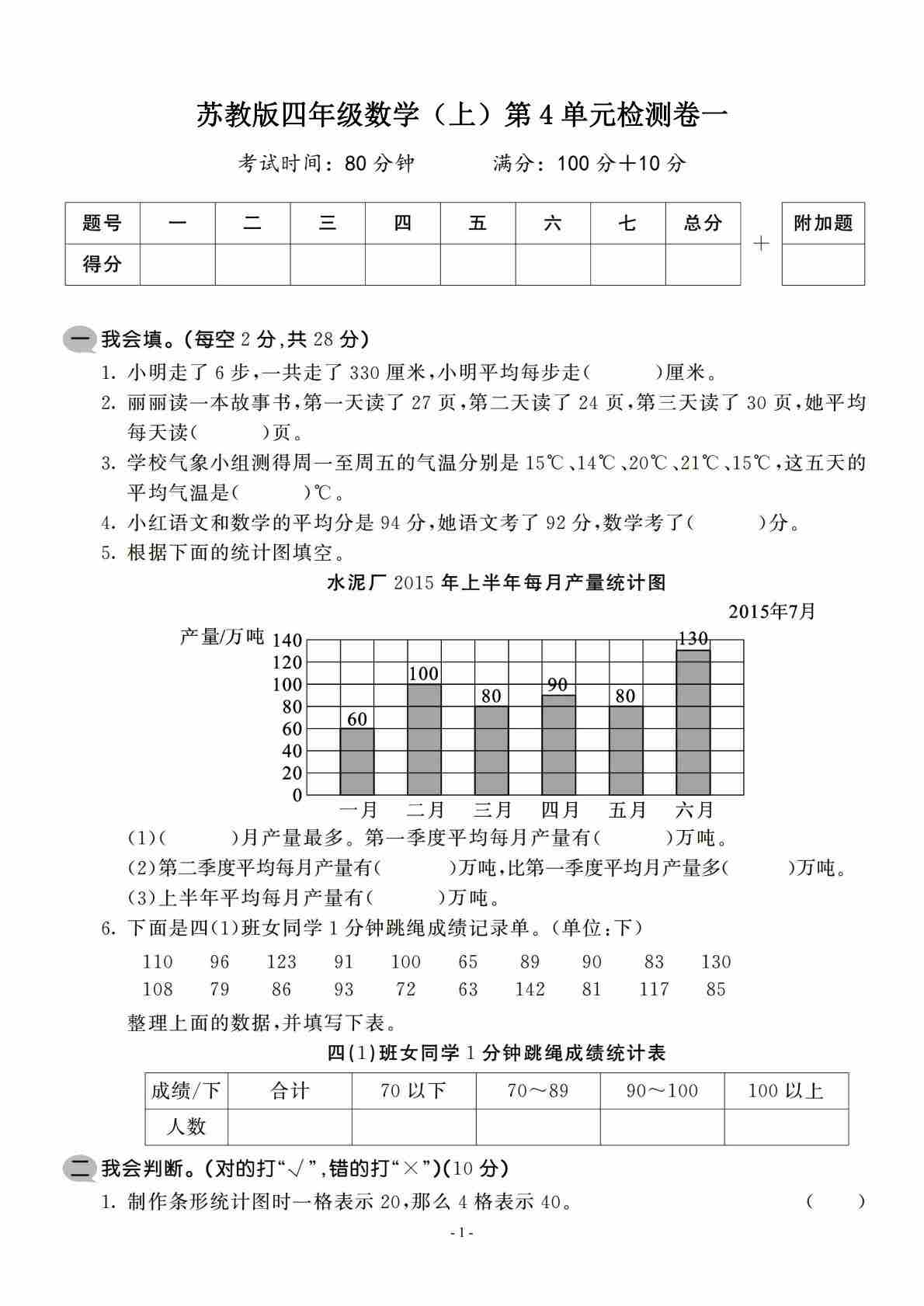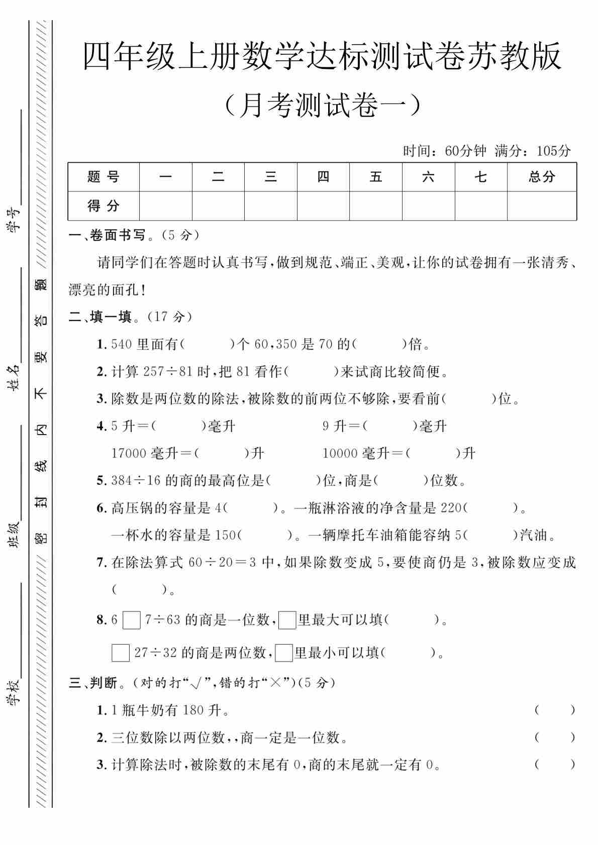 四上苏教版数学【第一次月考测试卷一】