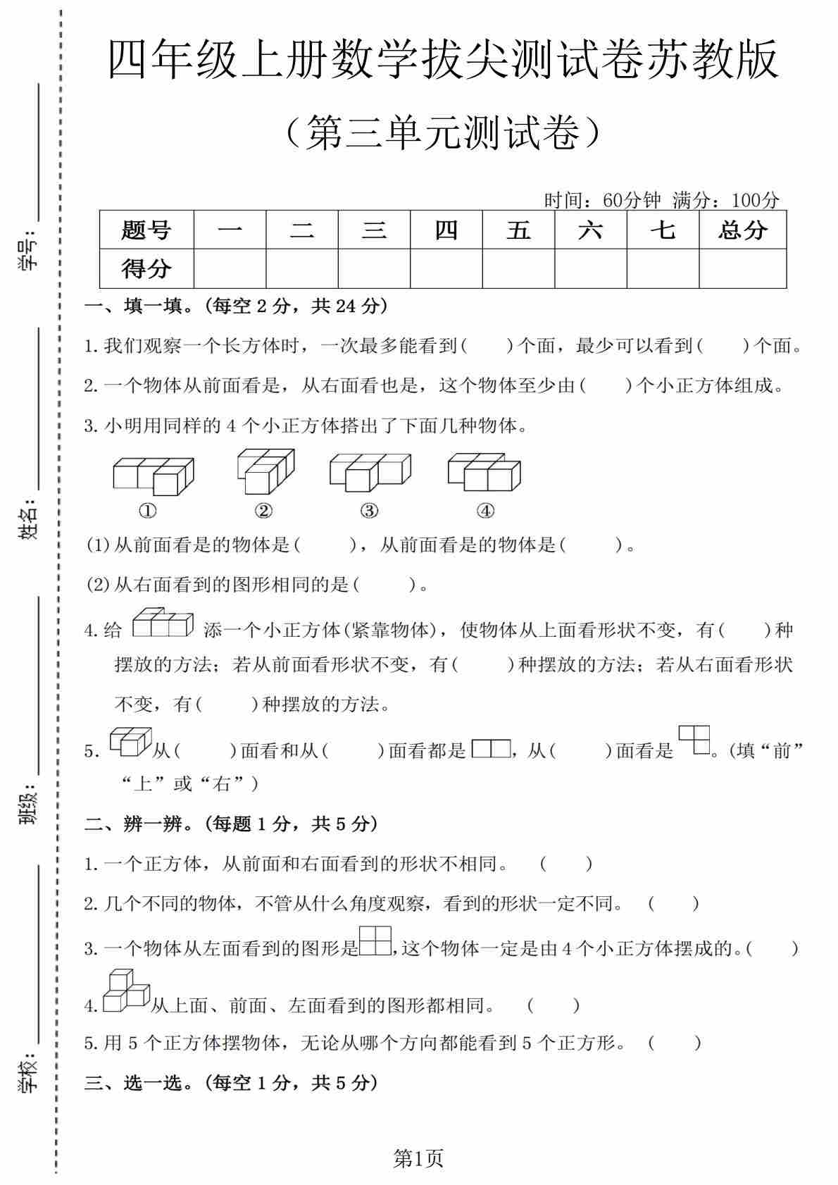 第3单元观察物体形题型突破——判断题(苏教版,含答案)