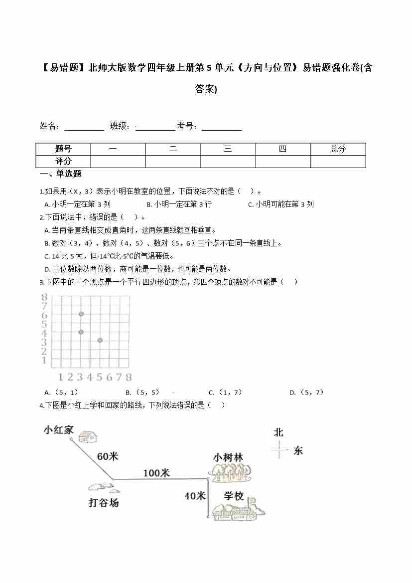 【易错题】北师大版数学四年级上册第5单元《方向与位置》易错题强化卷(含答案)