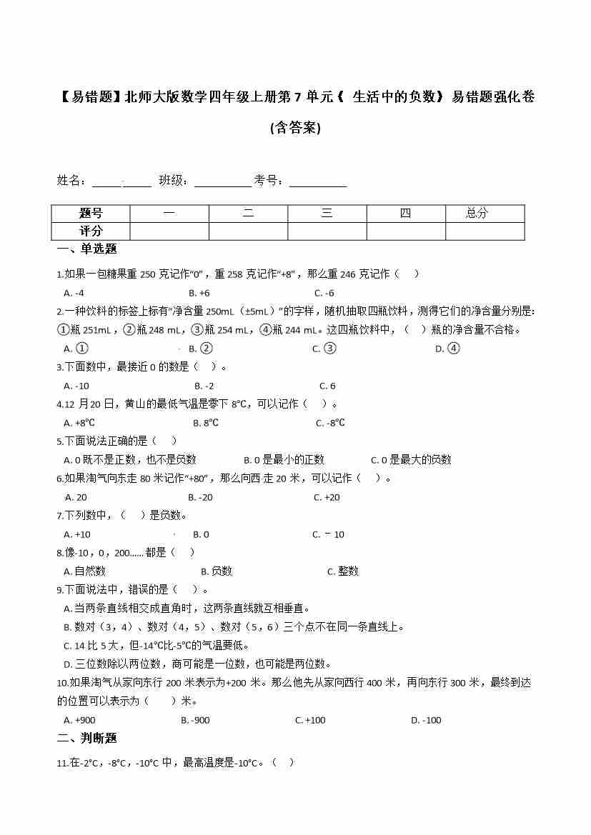 【易错题】北师大版数学四年级上册第7单元《 生活中的负数》(含答案)