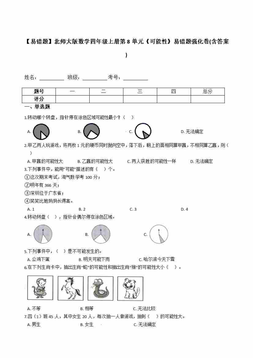 【易错题】北师大版数学四年级上册第8单元《可能性》(含答案)