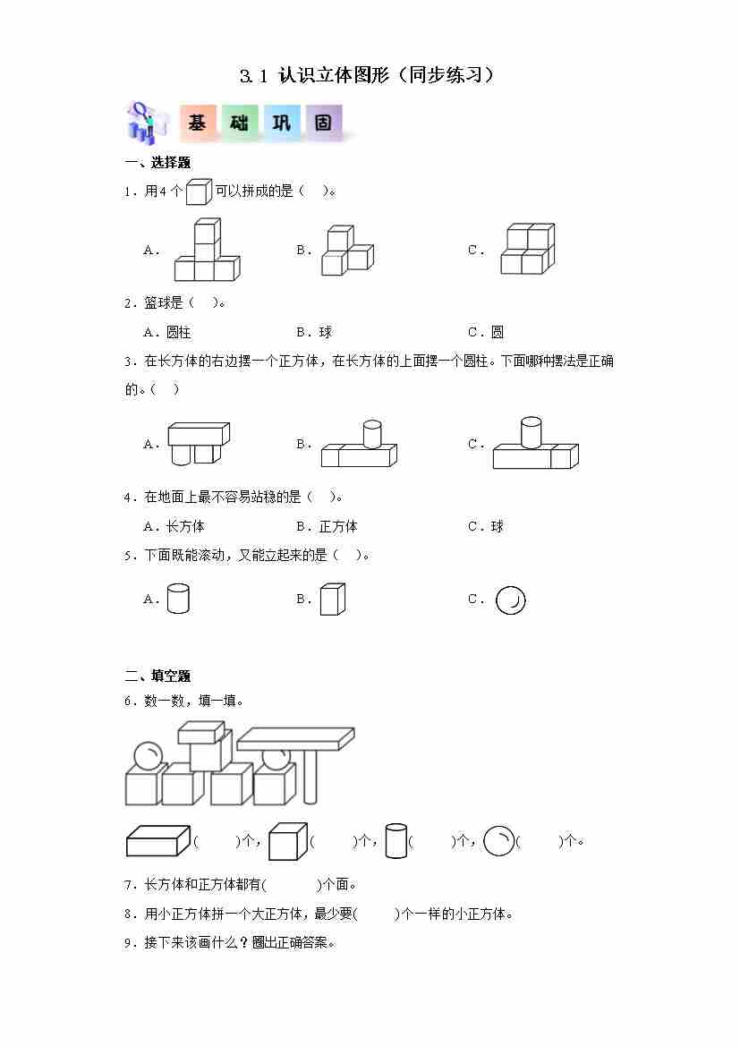 【同步分层作业】人教数学一上-3.1 认识立体图形