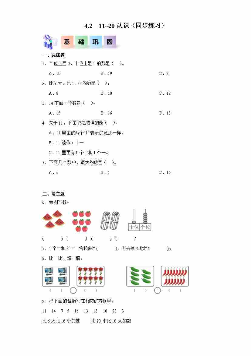 【同步分层作业】人教数学一上-4.2 11~20认识