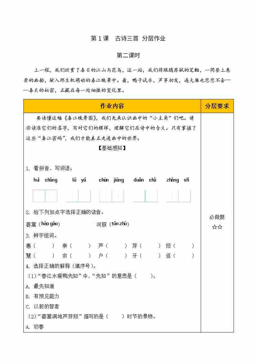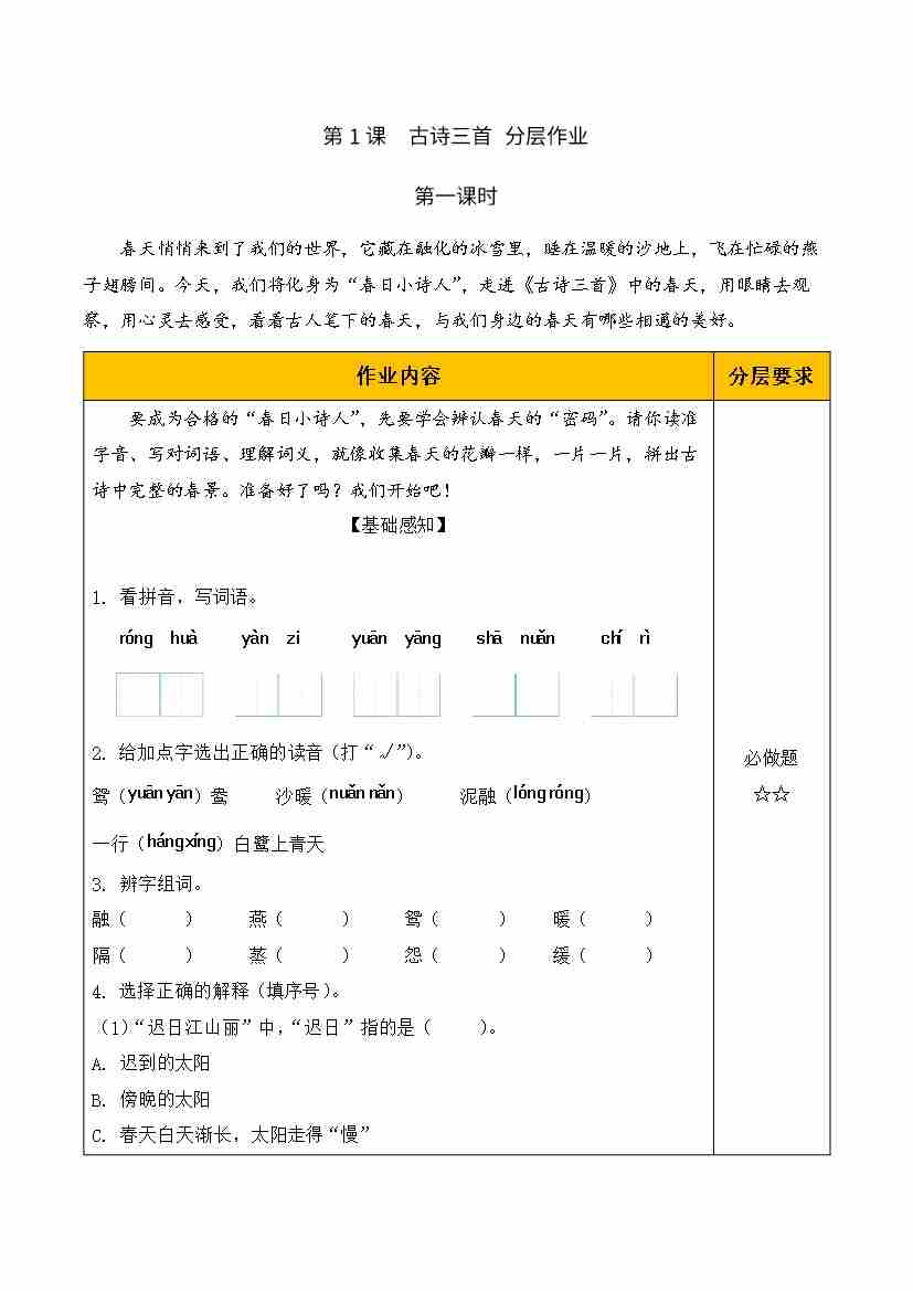 1.古诗三首 第一课时(分层作业)语文统编版三年级下册(新教材)