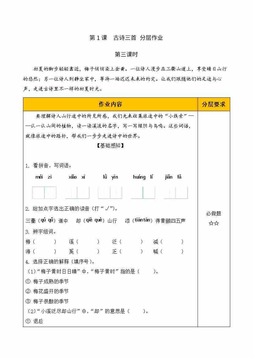 1.古诗三首 第三课时(分层作业)语文统编版三年级下册(新教材)