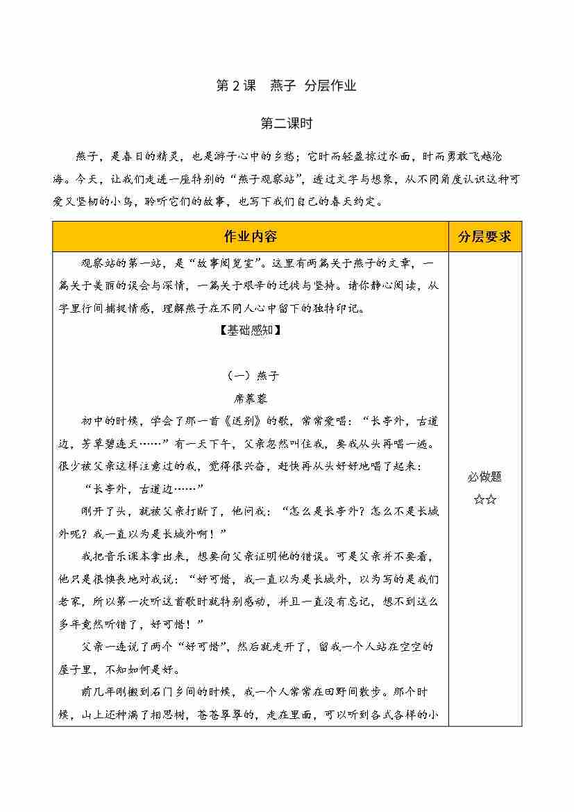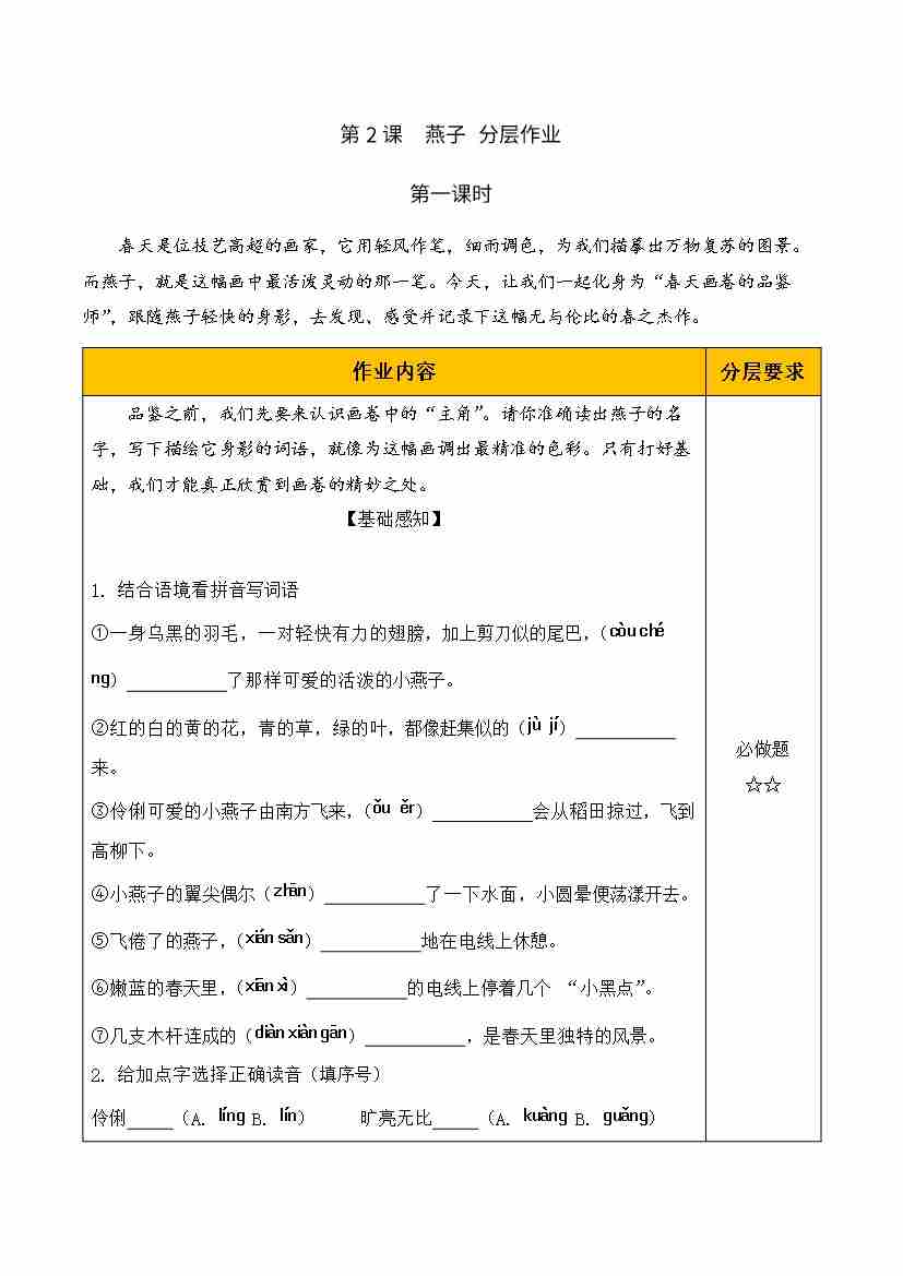 2.燕子 第一课时(分层作业)语文统编版三年级下册(新教材)