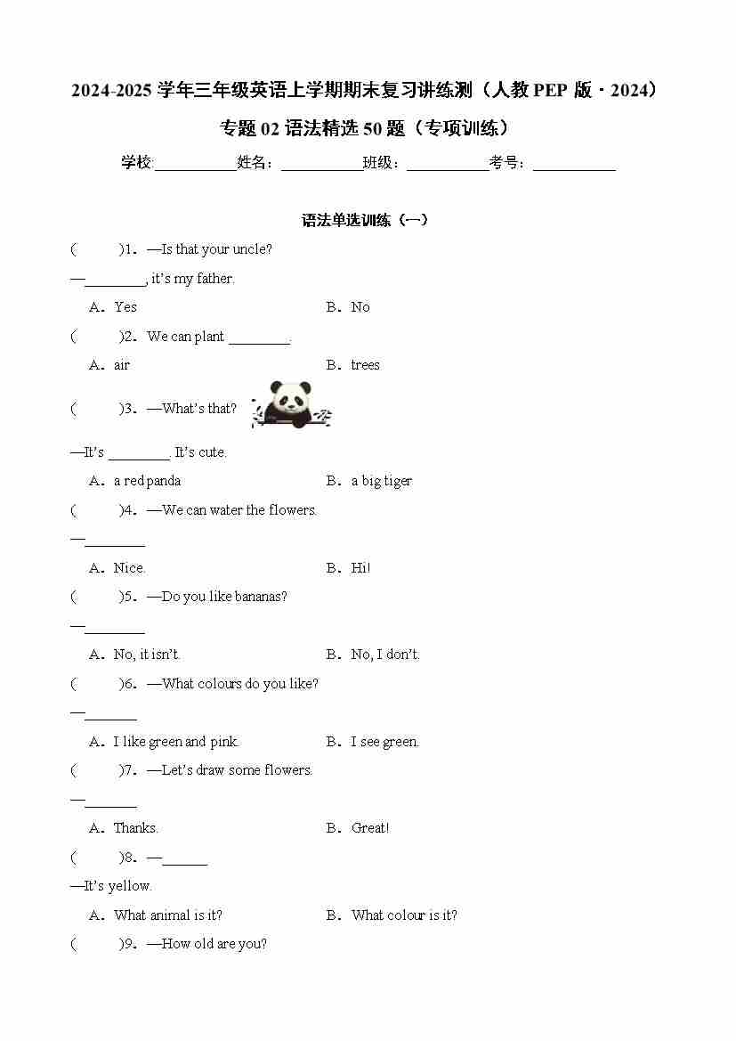 专题01词汇检测50题(专项训练)-2024-2025学年三年级英语上学期测(人教PEP版·2024秋)