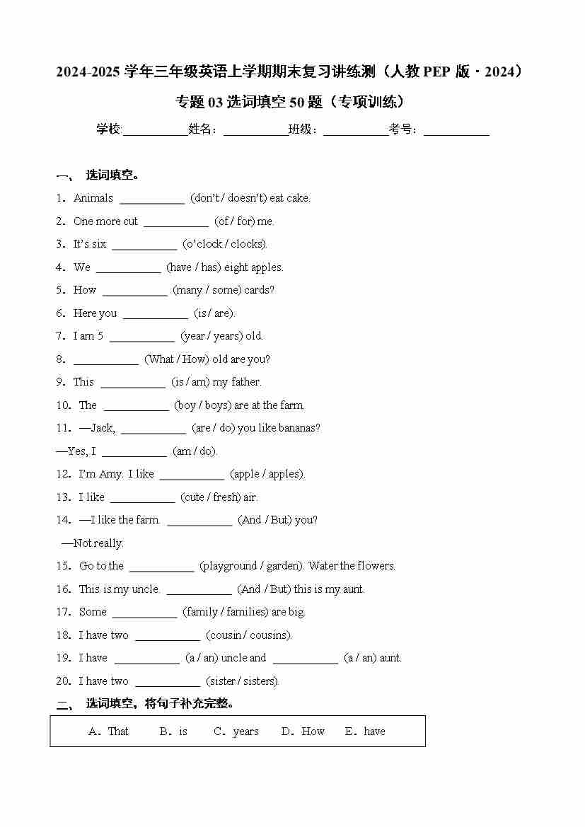 专题03选词填空50题(专项训练)-2024-2025学年三年级英语上学期测(人教PEP版·2024秋)