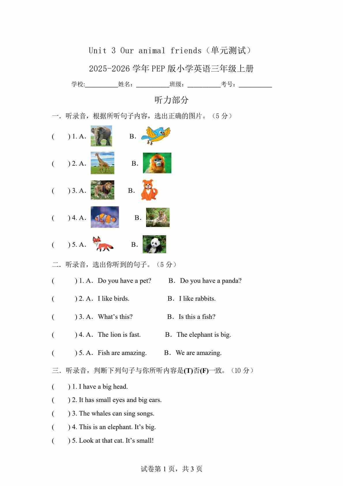 Unit 3 Our animal friends-2025-2026学年PEP版小学英语三年级上册