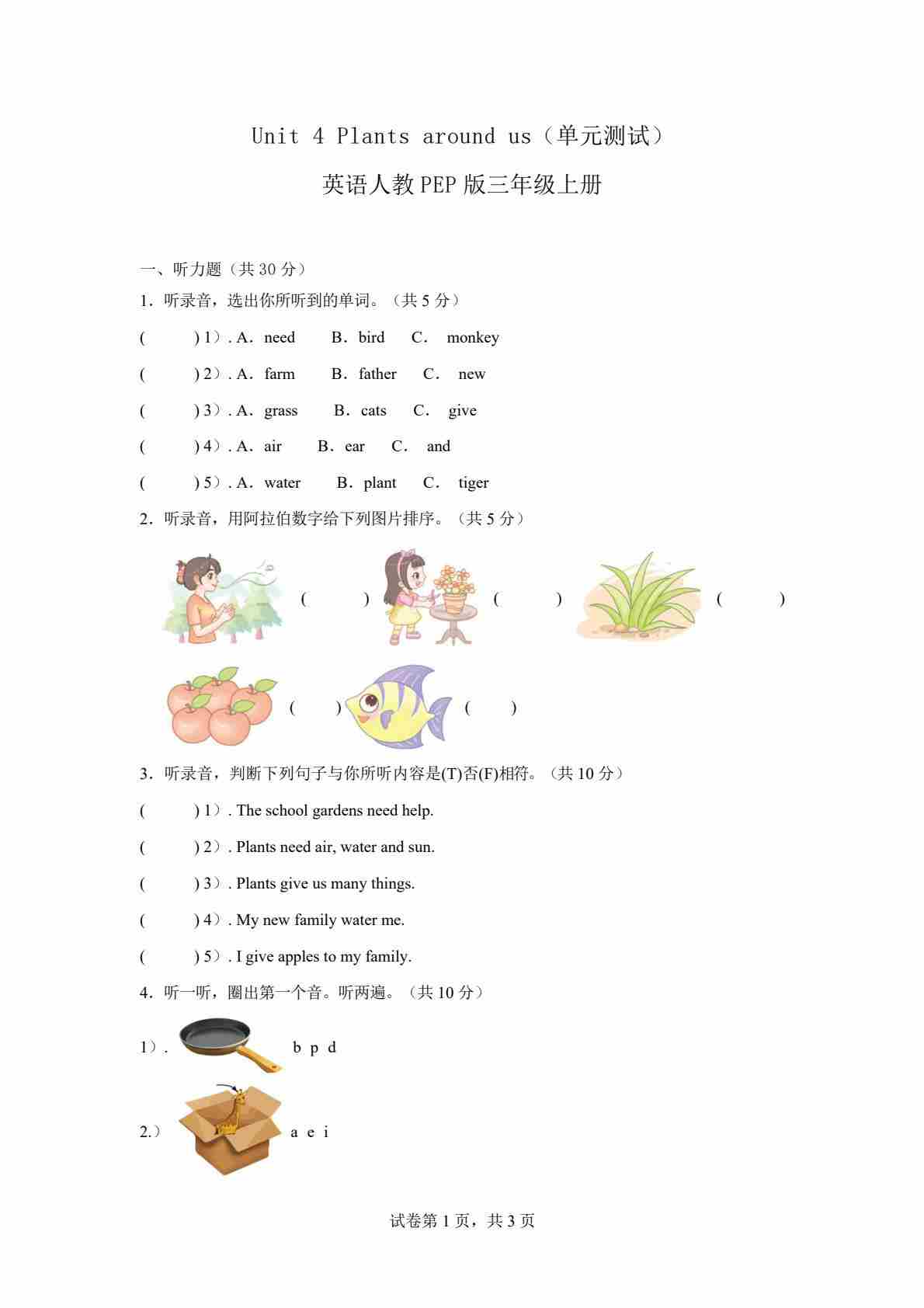 Unit 4 Plants around us -2025-2026学年PEP版小学英语三年级上册(原卷版)