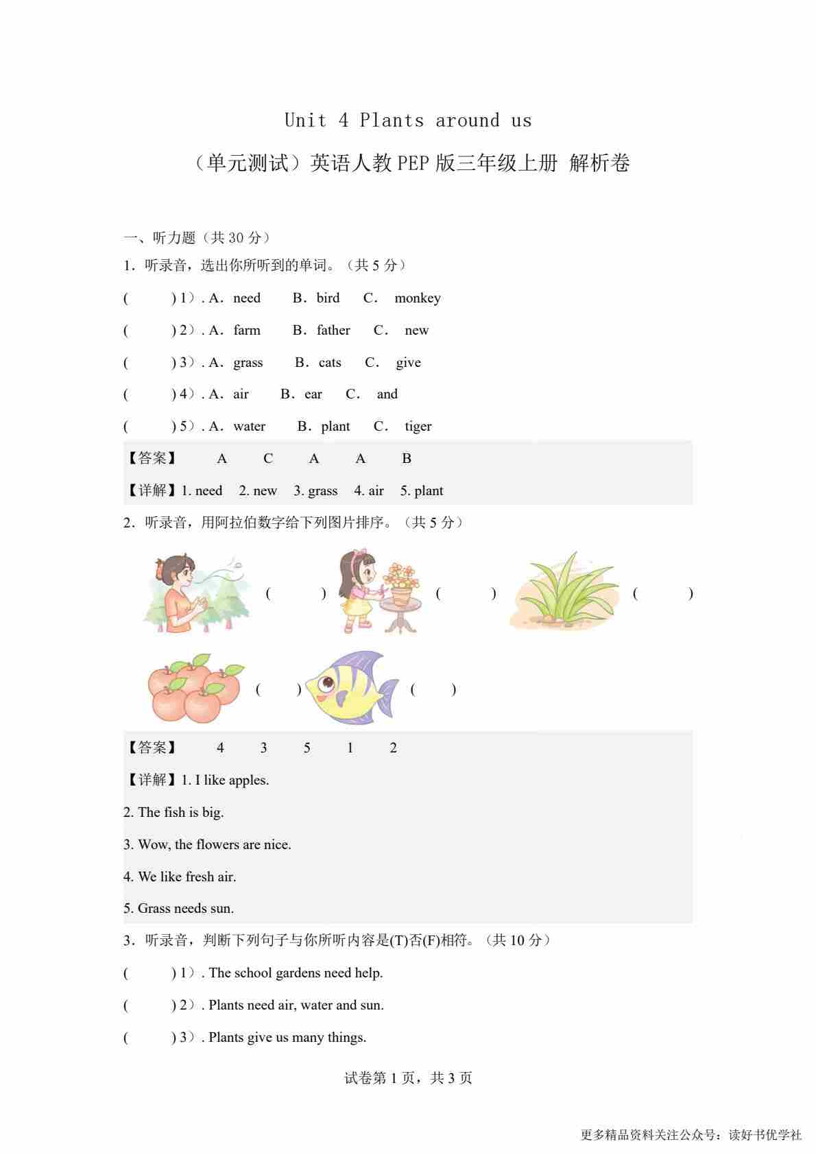 Unit 4 Plants around us -2025-2026学年PEP版小学英语三年级上册(解析版)