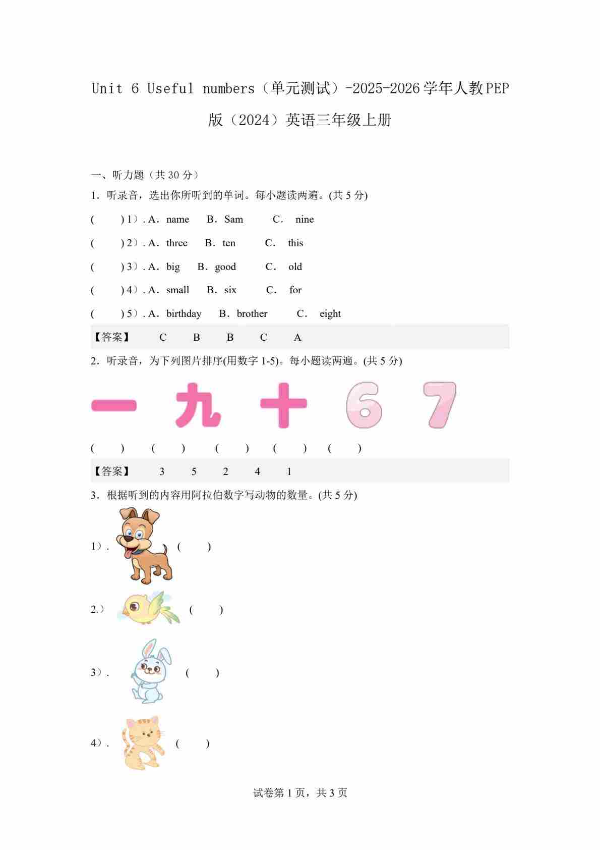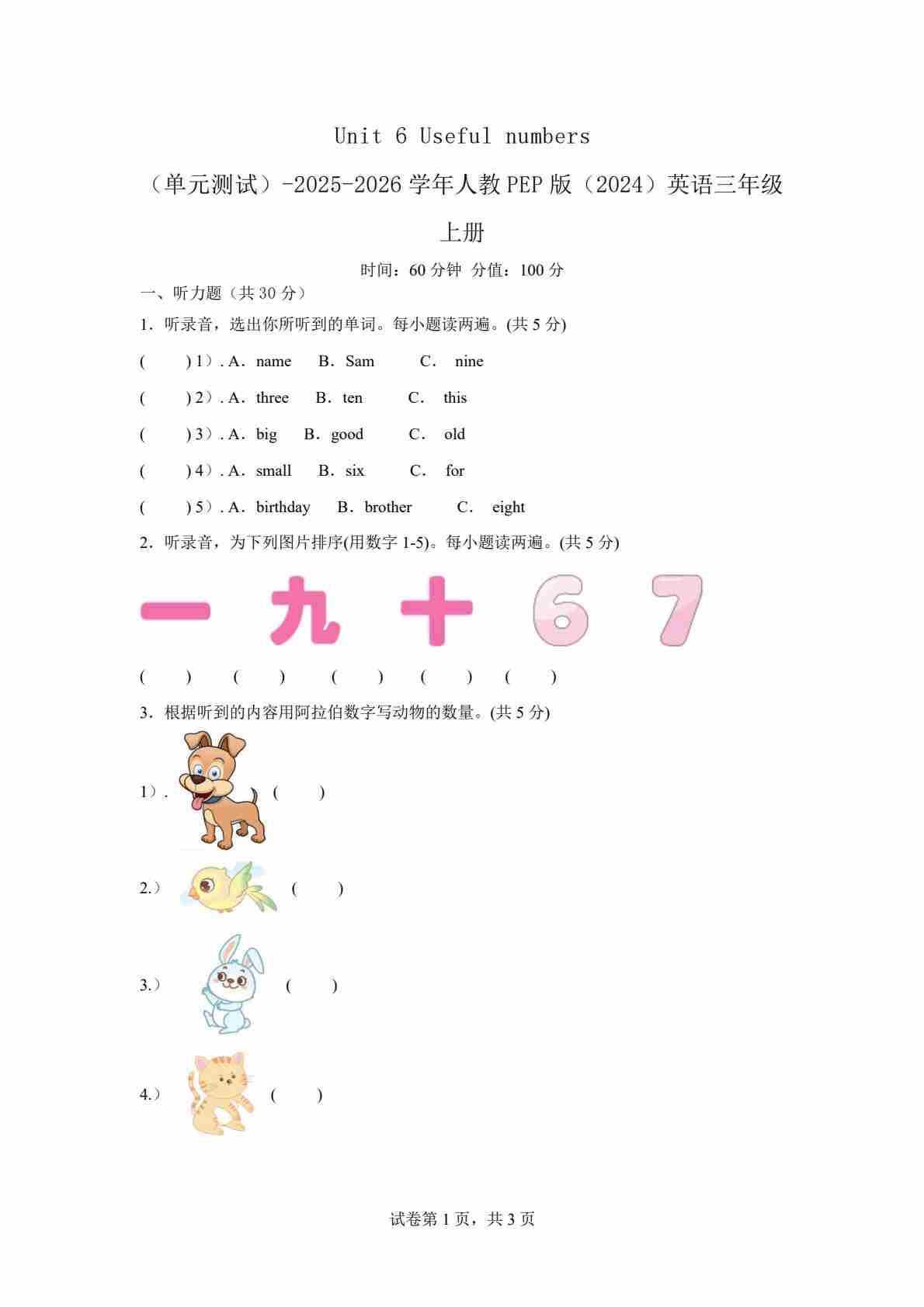 Unit 6 Useful numbers -2025-2026学年PEP版小学英语三年级上册(原卷版)