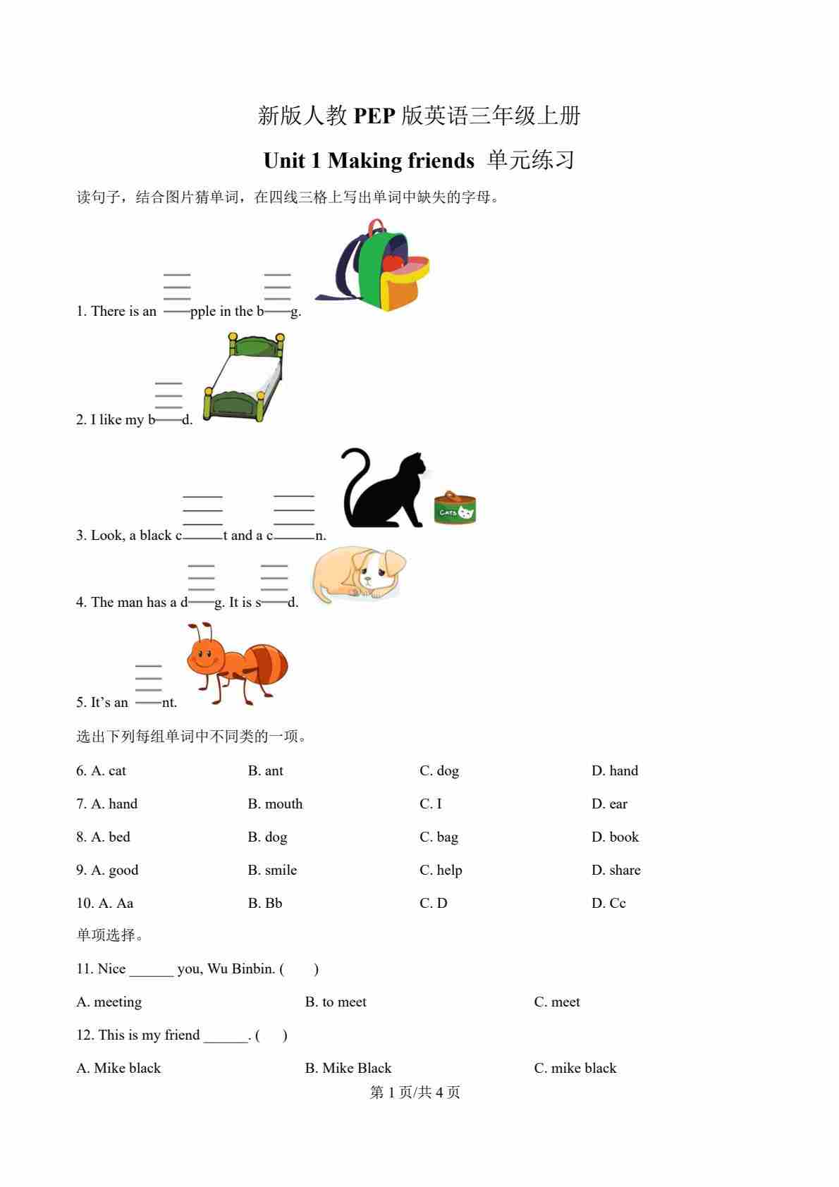 Unit 1 Making friends -2025-2026学年PEP版小学英语三年级上册(原卷版)