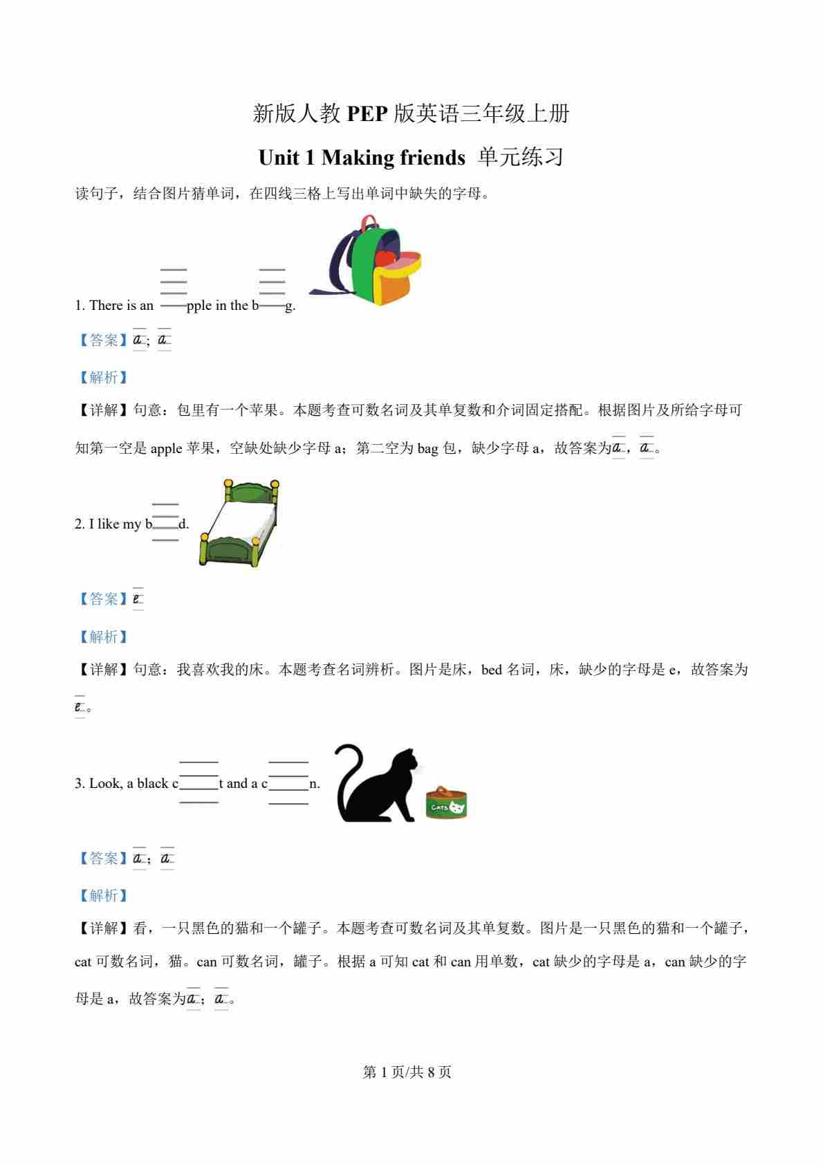 Unit 1 Making friends -2025-2026学年PEP版小学英语三年级上册(解析版)
