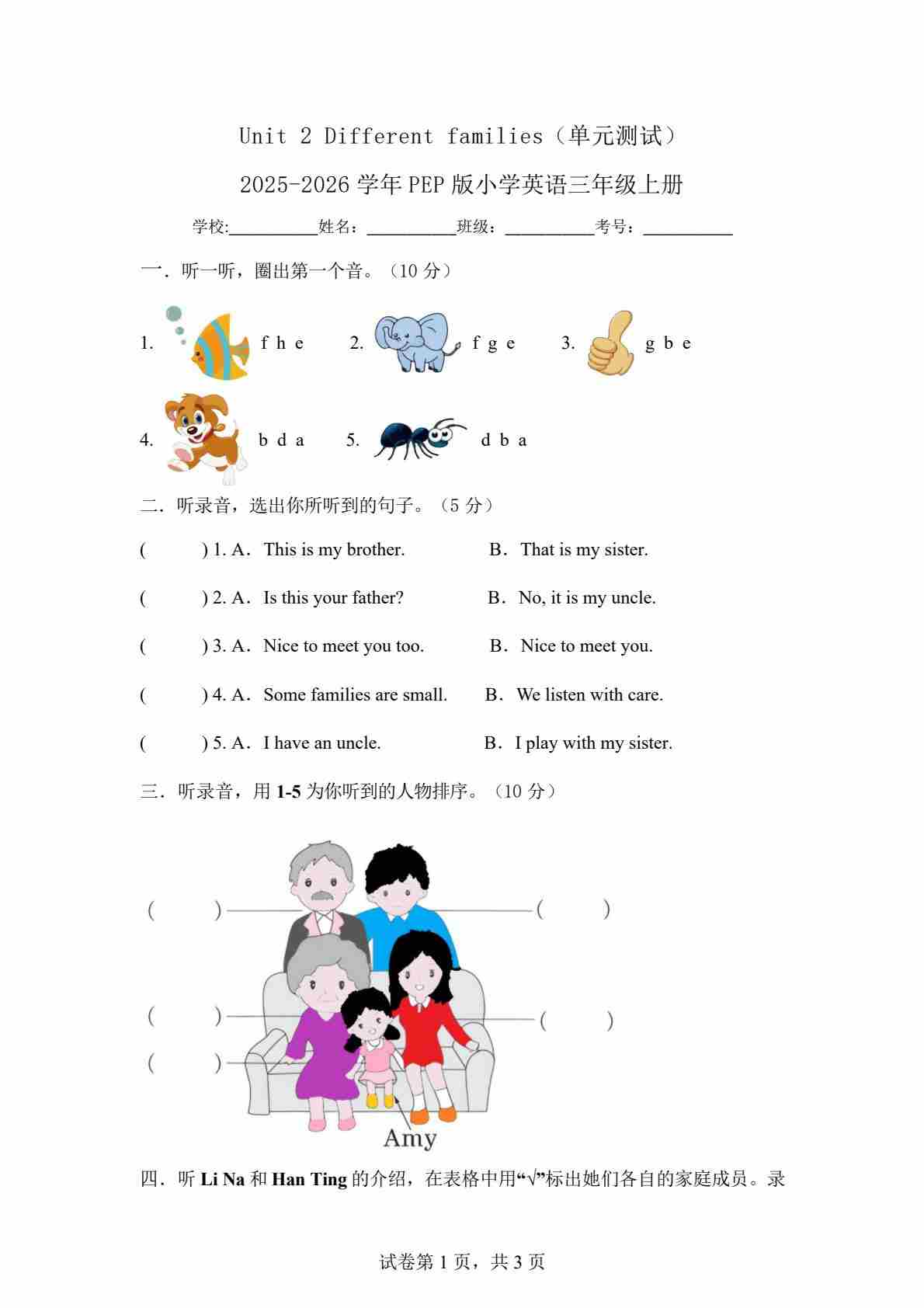 Unit 2 Different families-2025-2026学年PEP版小学英语三年级上册