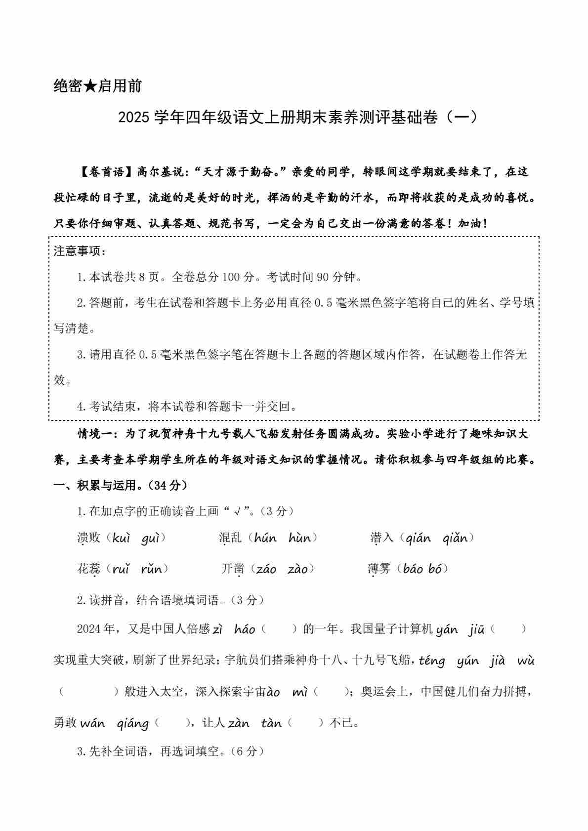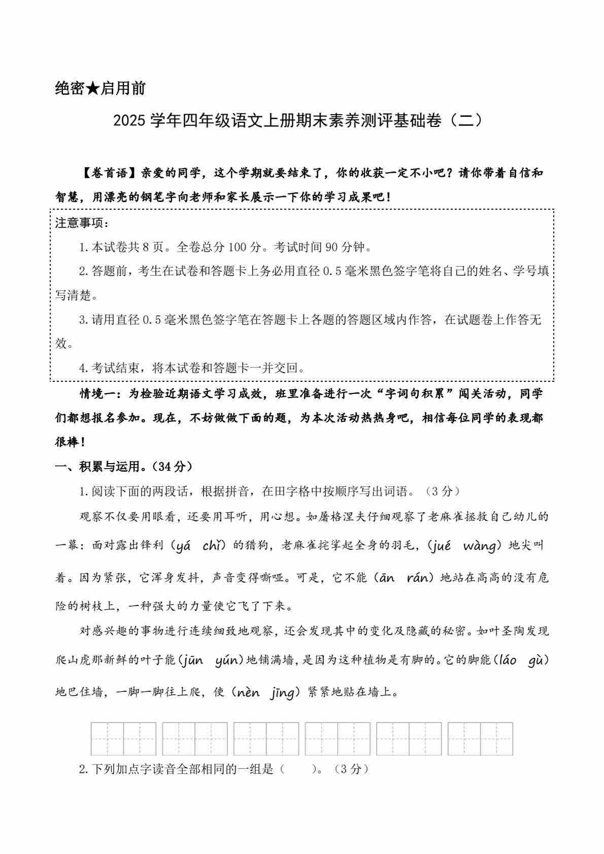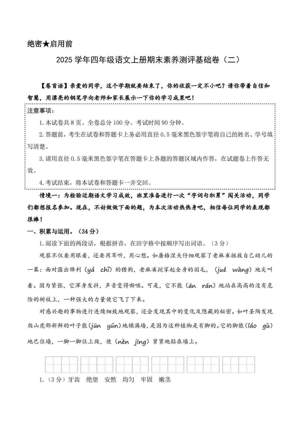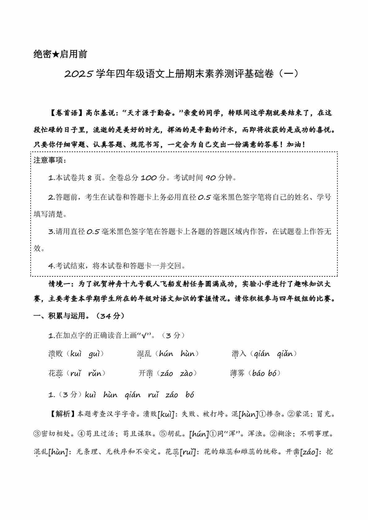 2025学年四年级语文上册期末素养测评基础卷1 答案解析