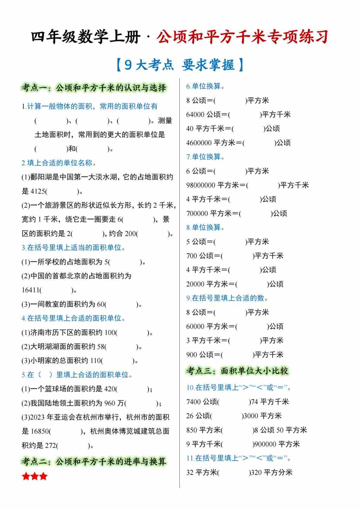 第二单元 公顷和平方千米【九大考点】含答案解析