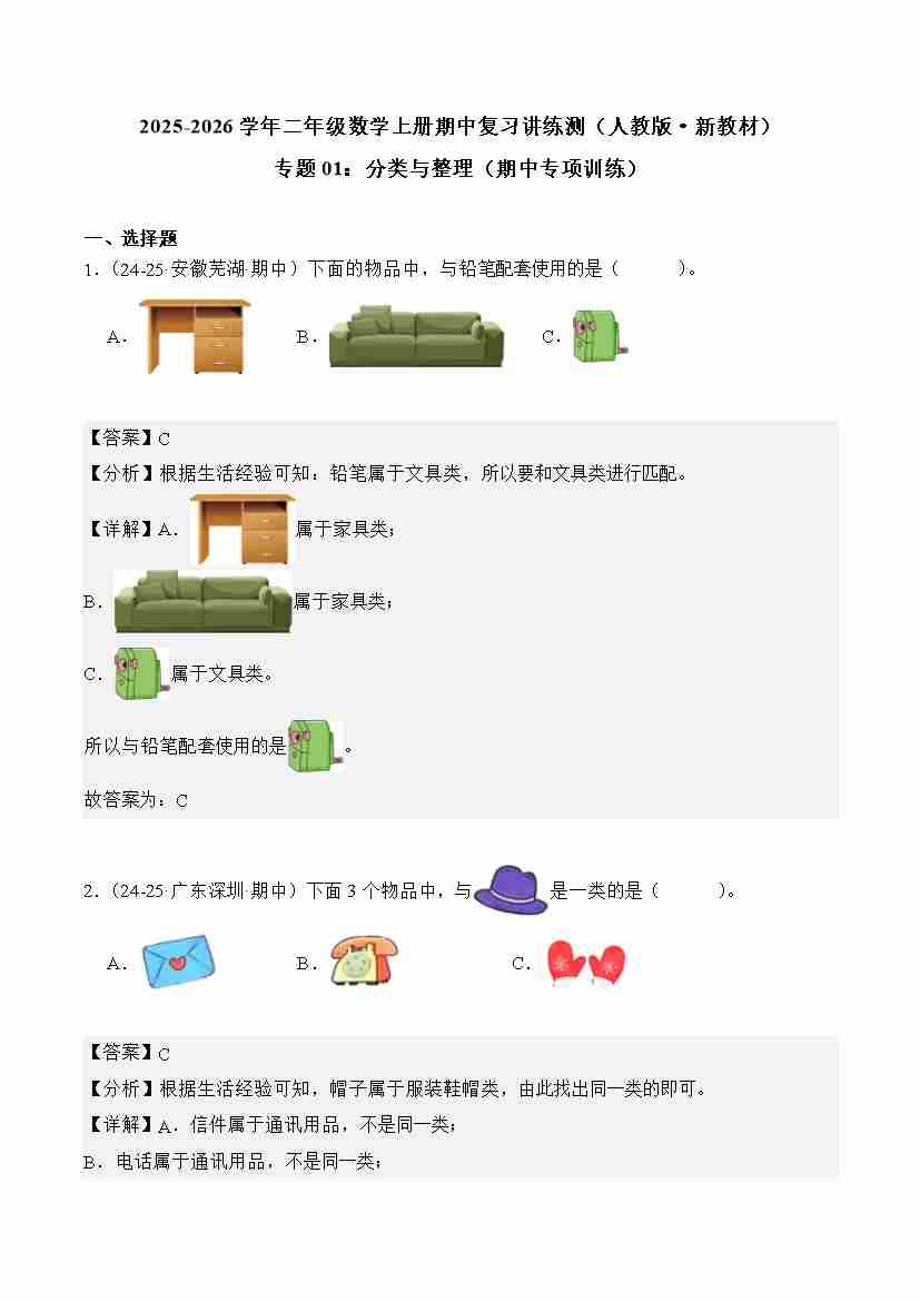 2025-2026学年二年级数学上册人教版期中复习讲练测 专题01:分类与整理(期中专项训练)(解析版)