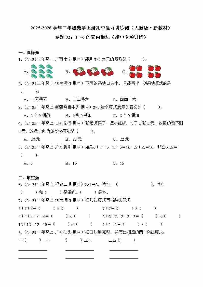 2025-2026学年二年级数学上册人教版期中复习讲练测专题02:1~6的表内乘法(期中专项训练)(学生版)