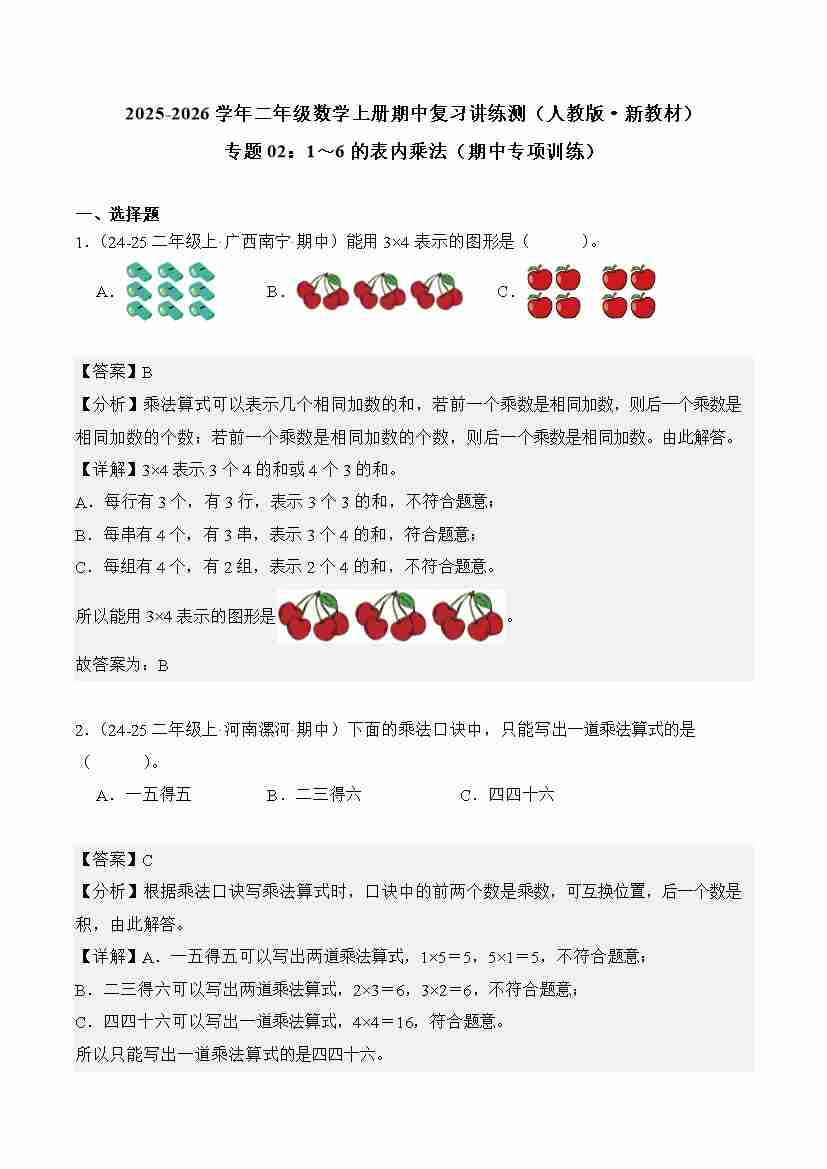2025-2026学年二年级数学上册人教版期中复习讲练测专题02:1~6的表内乘法(期中专项训练)(解析版)