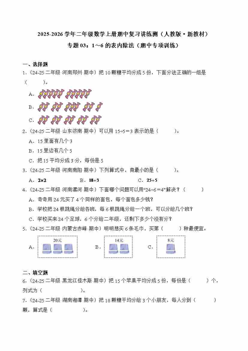 2025-2026学年二年级数学上册人教版期中复习讲练测专题03:1~6的表内除法(期中专项训练)(学生版)