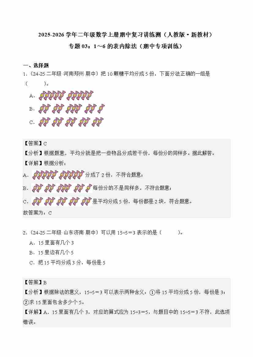2025-2026学年二年级数学上册人教版期中复习讲练测专题03:1~6的表内除法(期中专项训练)(解析版)