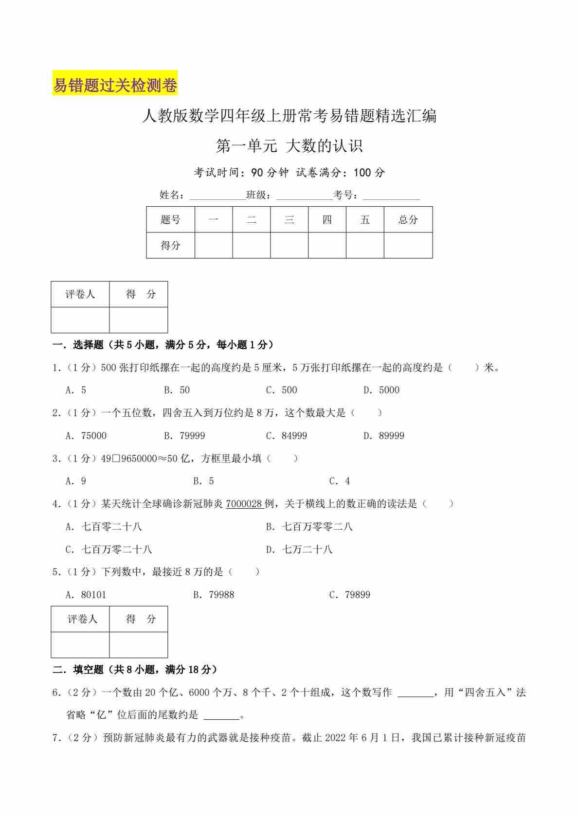 【第一单元易错题】人教数学四年级上册
