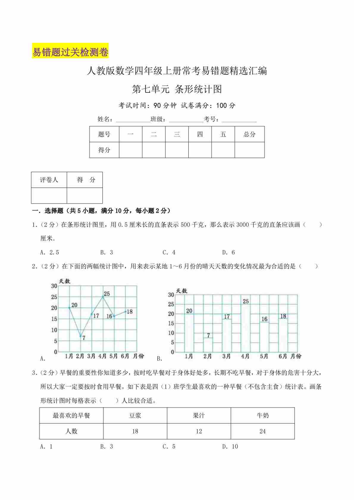 【第七单元易错题】人教数学四年级上册