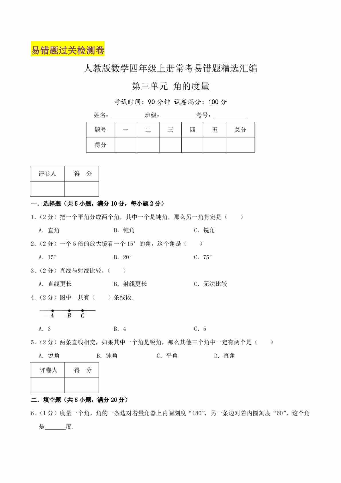 【第二单元易错题】人教数学四年级上册