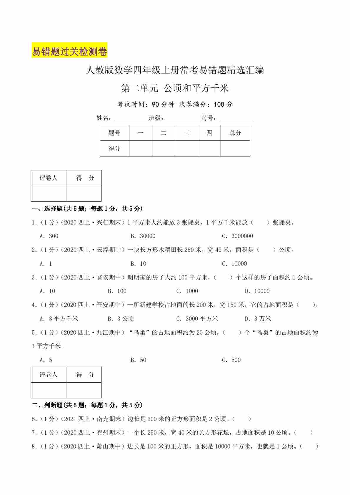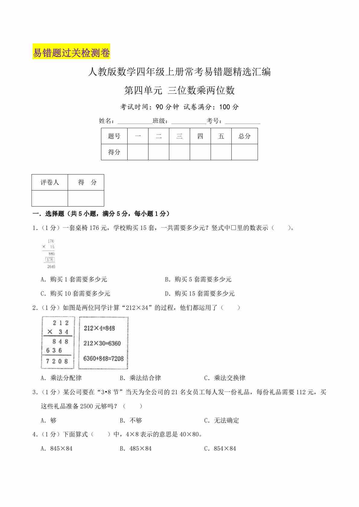 【第五单元易错题】人教数学四年级上册
