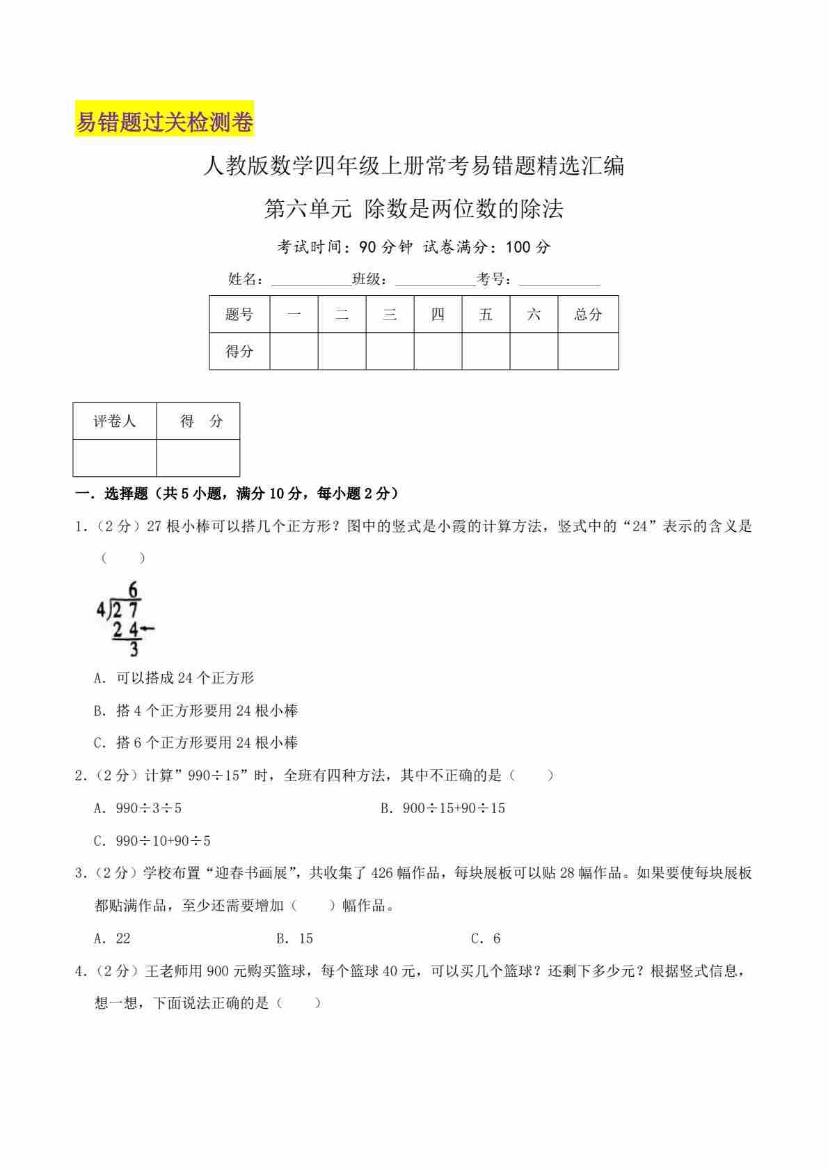 【第六单元易错题】人教数学四年级上册
