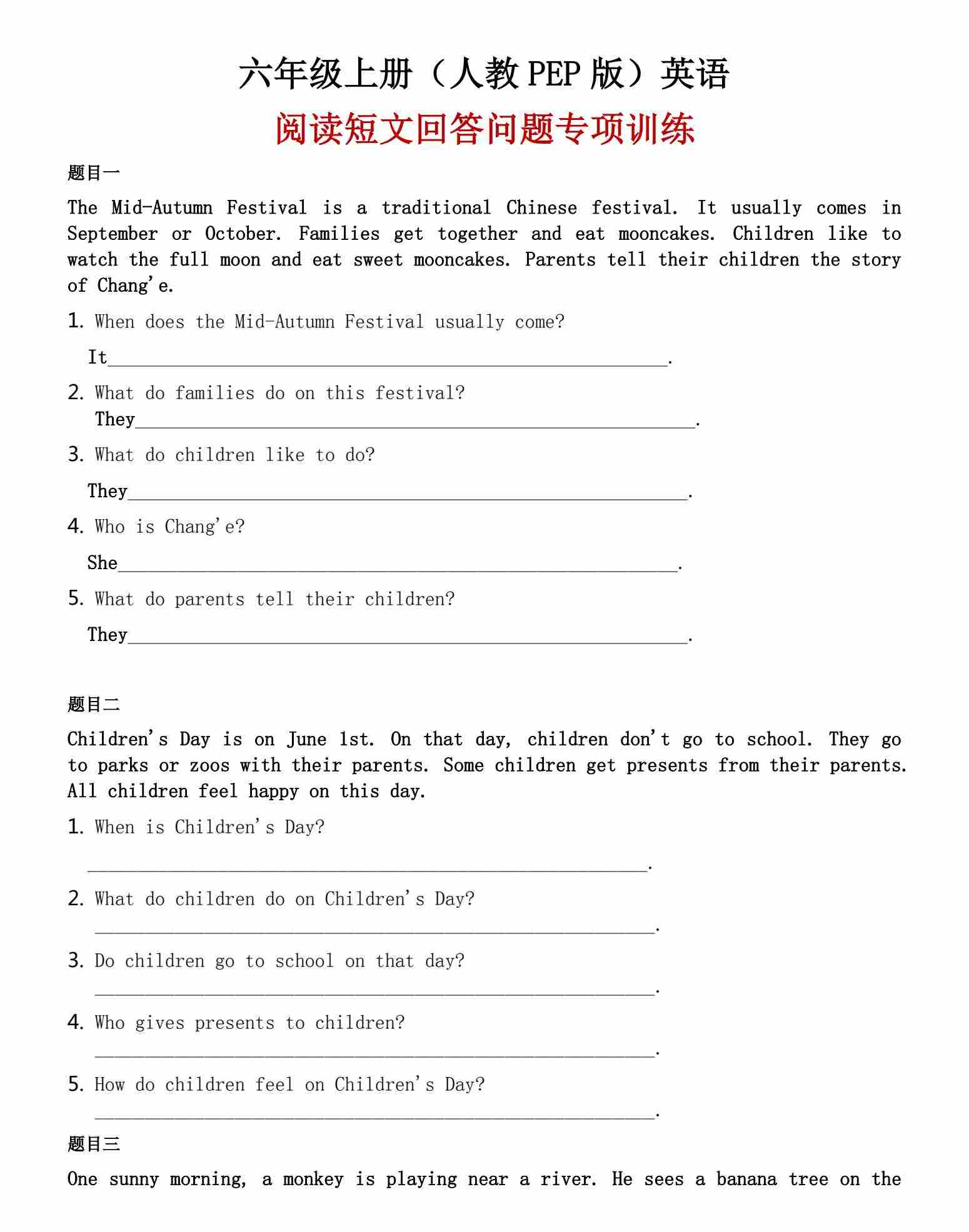 六上人教PEP版英语【期末复习阅读短文回答问题专项训练】