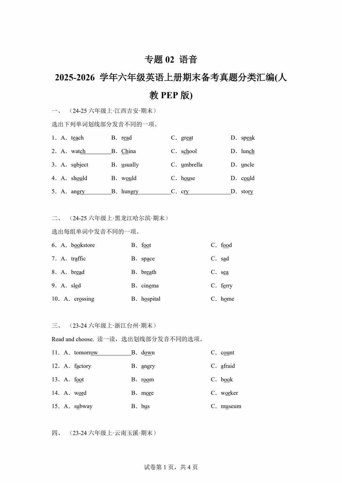 六上人教PEP版英语【期末真题汇编:专题02 语音】