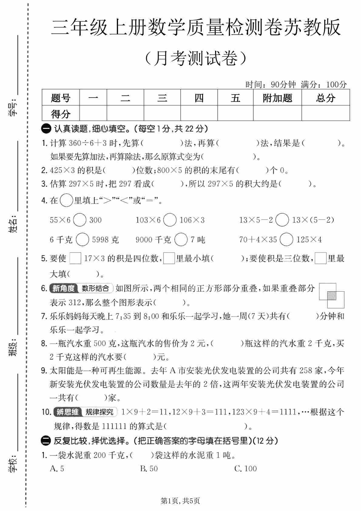 三(上)2025秋苏教版数学【第三单元真题测试卷1】