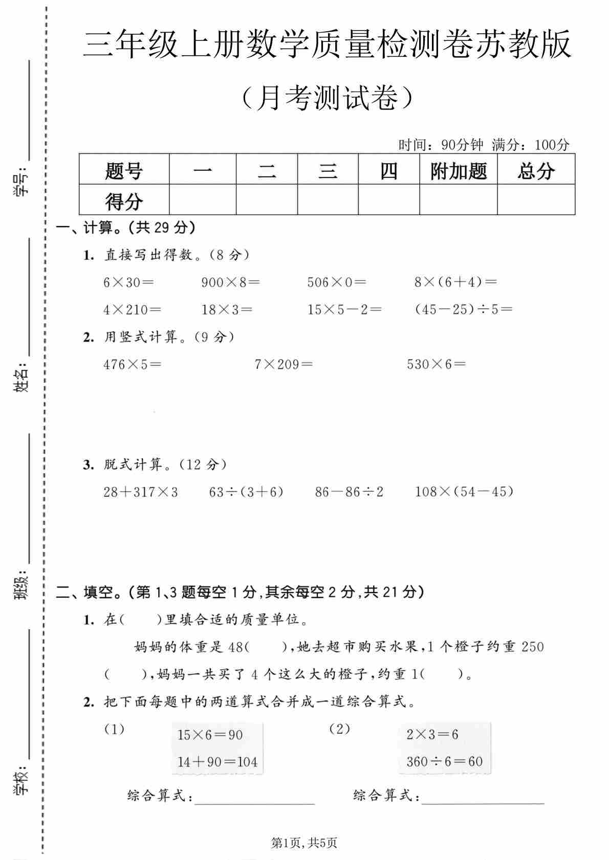 三(上)2025秋苏教版数学【第一次月考测试卷1】